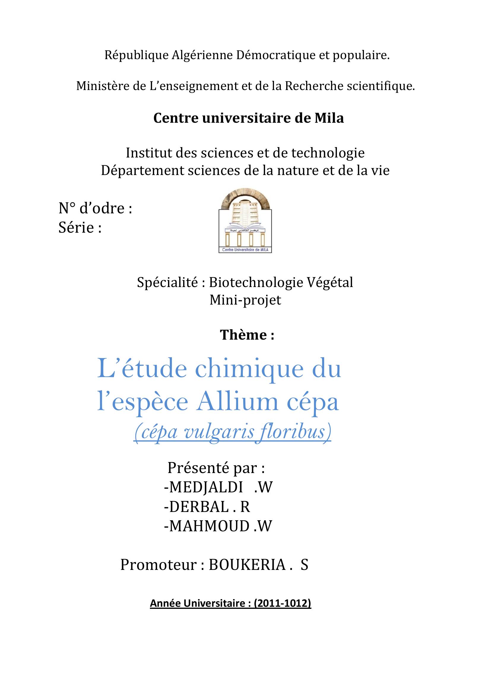 MEDJALDI .W et al. (2012). L'étude chimique du l'espéce allium cépa (cépa vulgaris floribus).