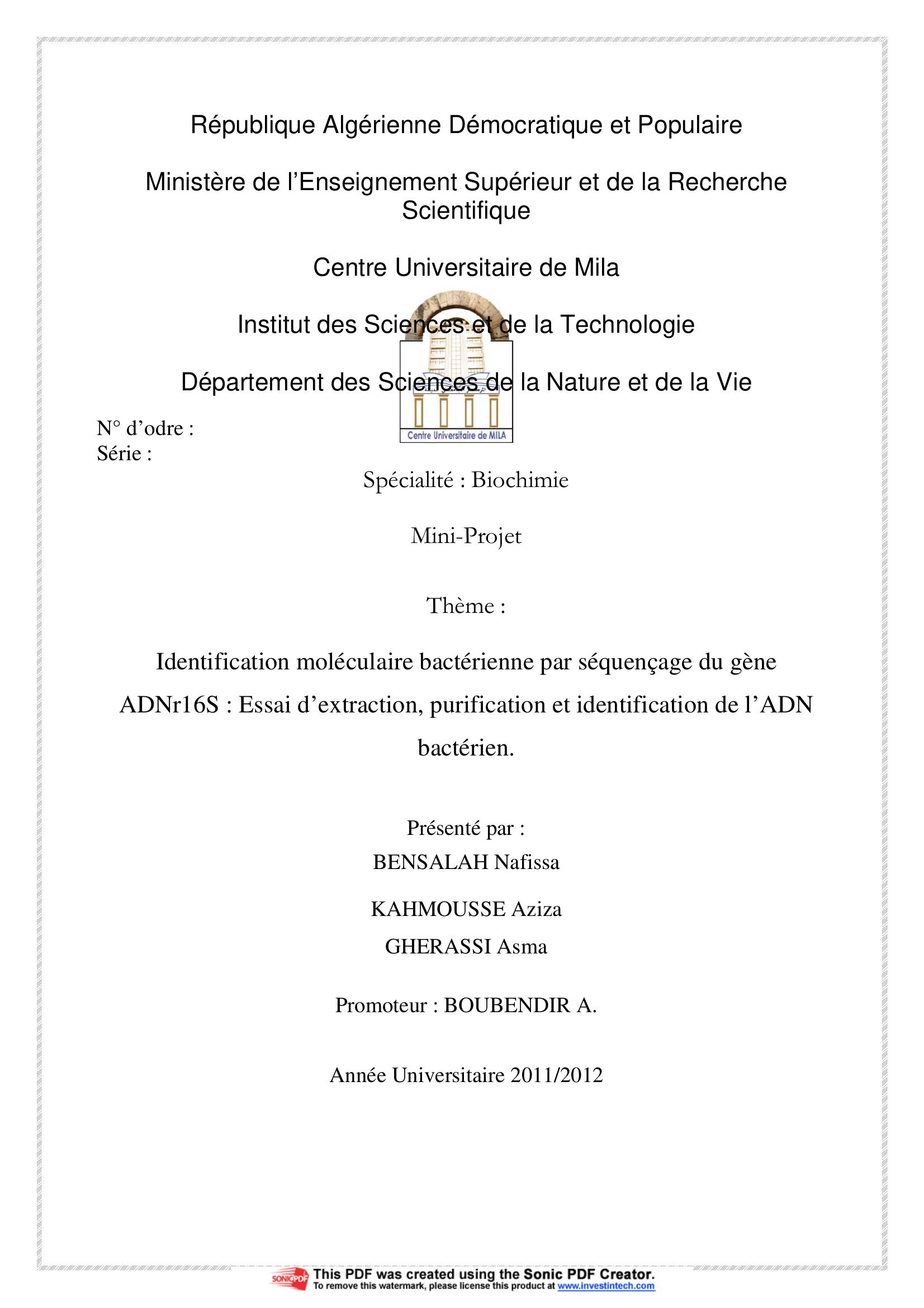 Bensalah Nafissa et al. (2012). Identification moléculaire bactérienne par séquencage du géne ADNr :Essai d'extraction ,purification et identification de l'ADN bactérien.