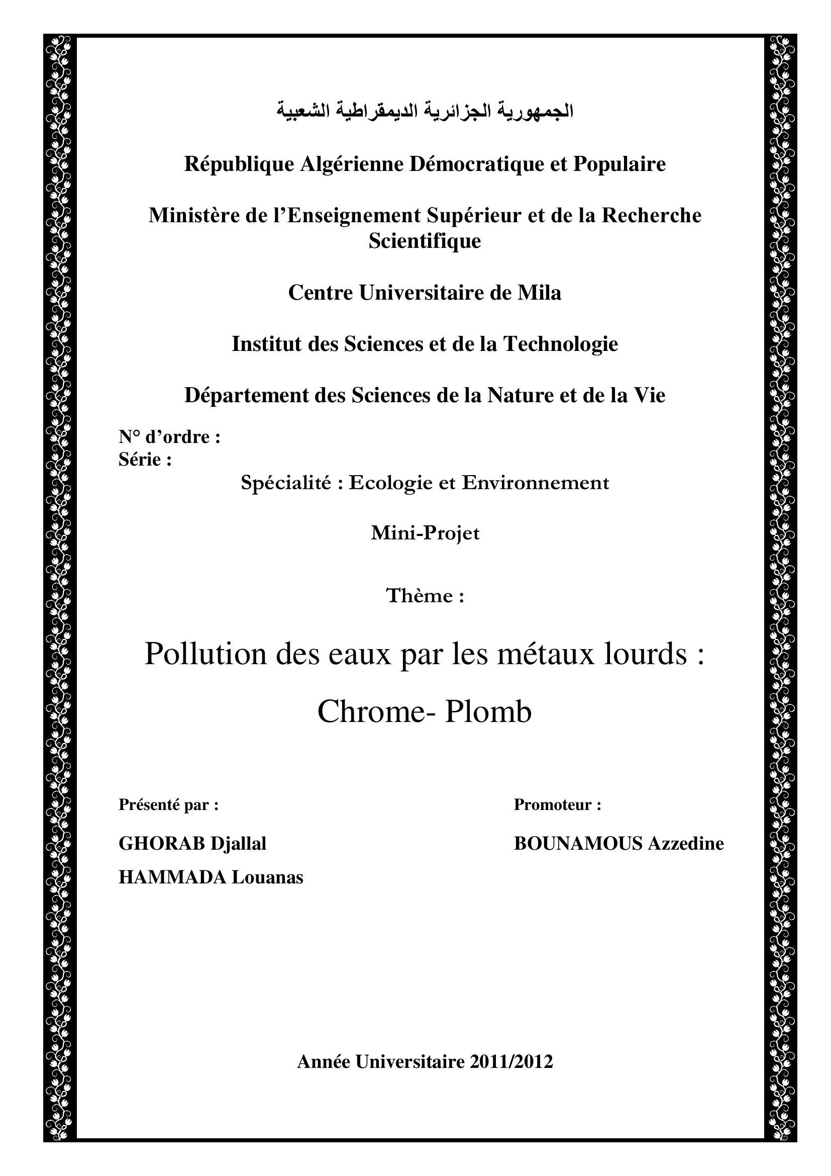 ghorab djallal & Hammada Louanas (2012). Pollution des eaux par les métaux lourds :chrome-plomb.