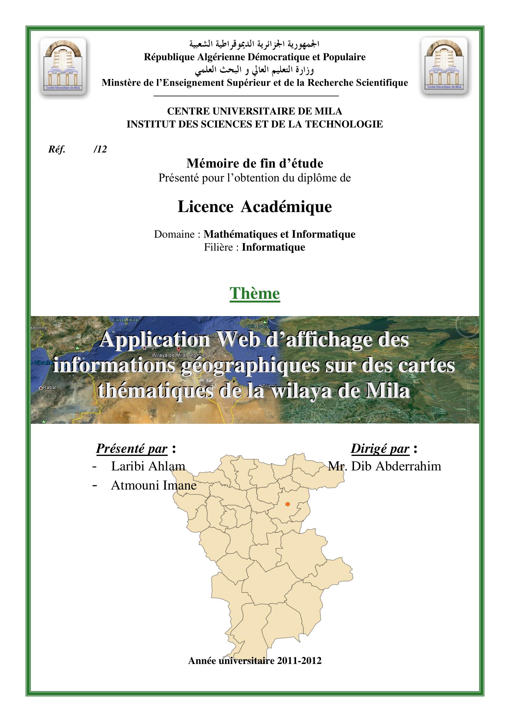 atmouni imane & Dib Abderrahim( encadreur) (2012). Application web d'affichage des informations géografiques sur des cartes thématiques de wilaya de mila.