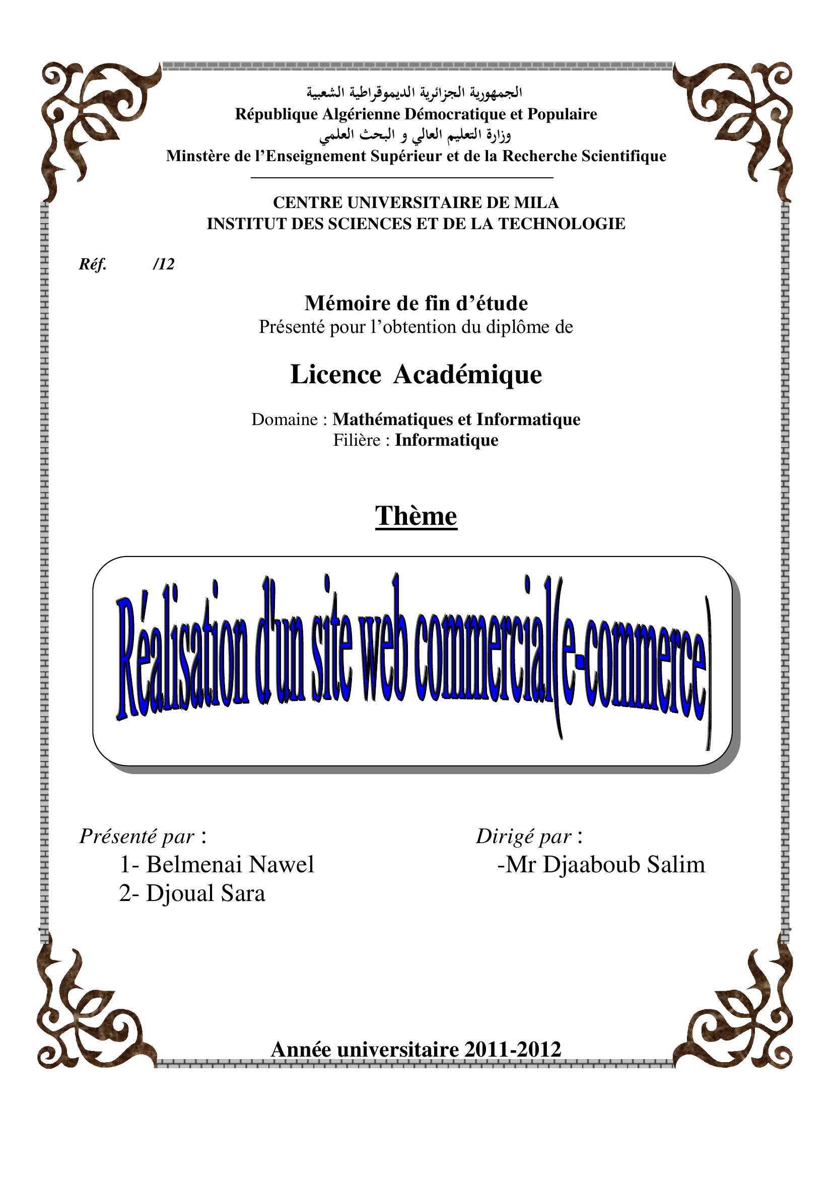 belmenai nawel & Djaaboub Salim( encadreur) (2012). Réalisation d'un site web commercial (e- commerce.