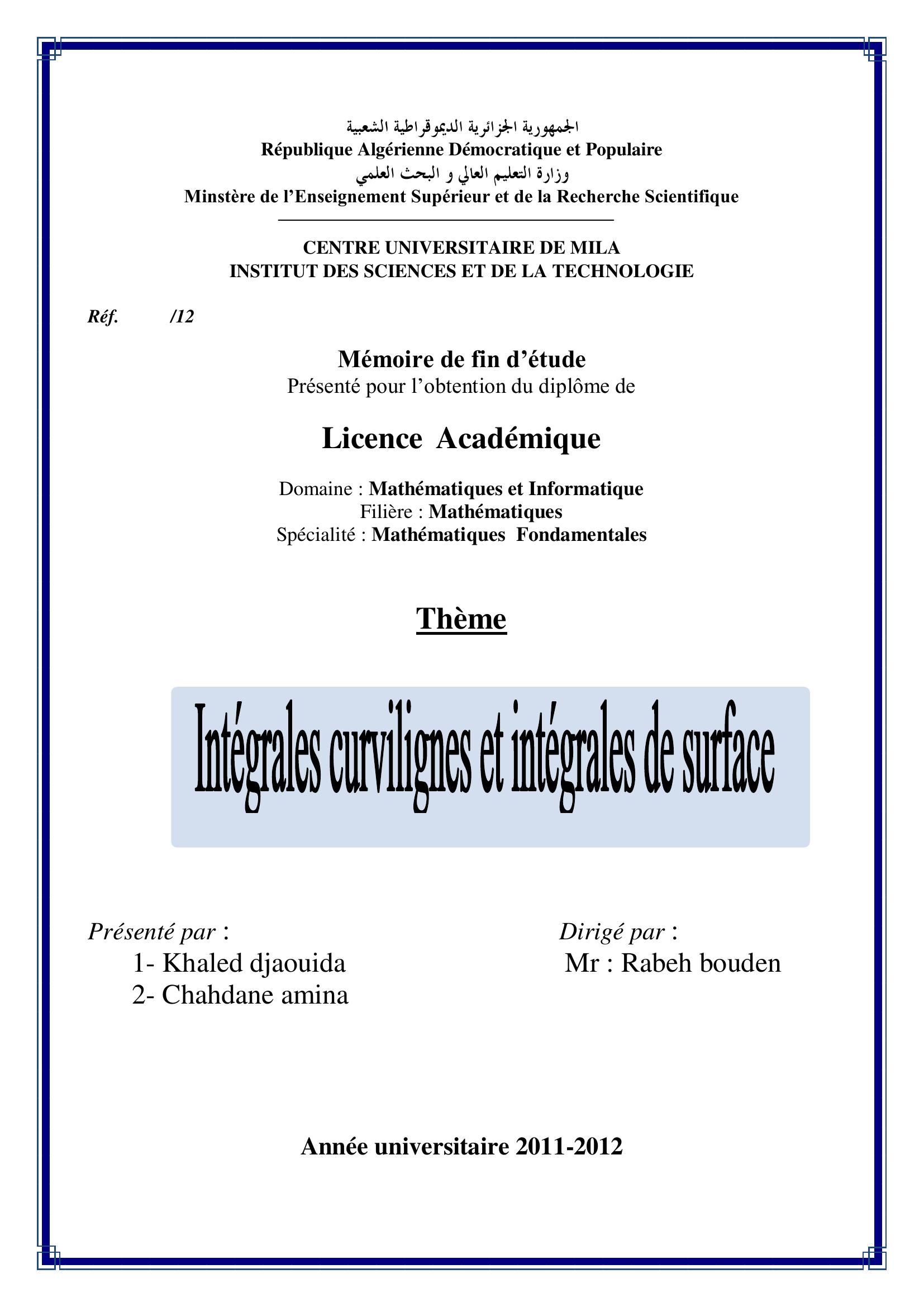 khaled djaouida & Bouden Rabah encadreur (2012). Intégrales curvilignes et intégrales de surface.