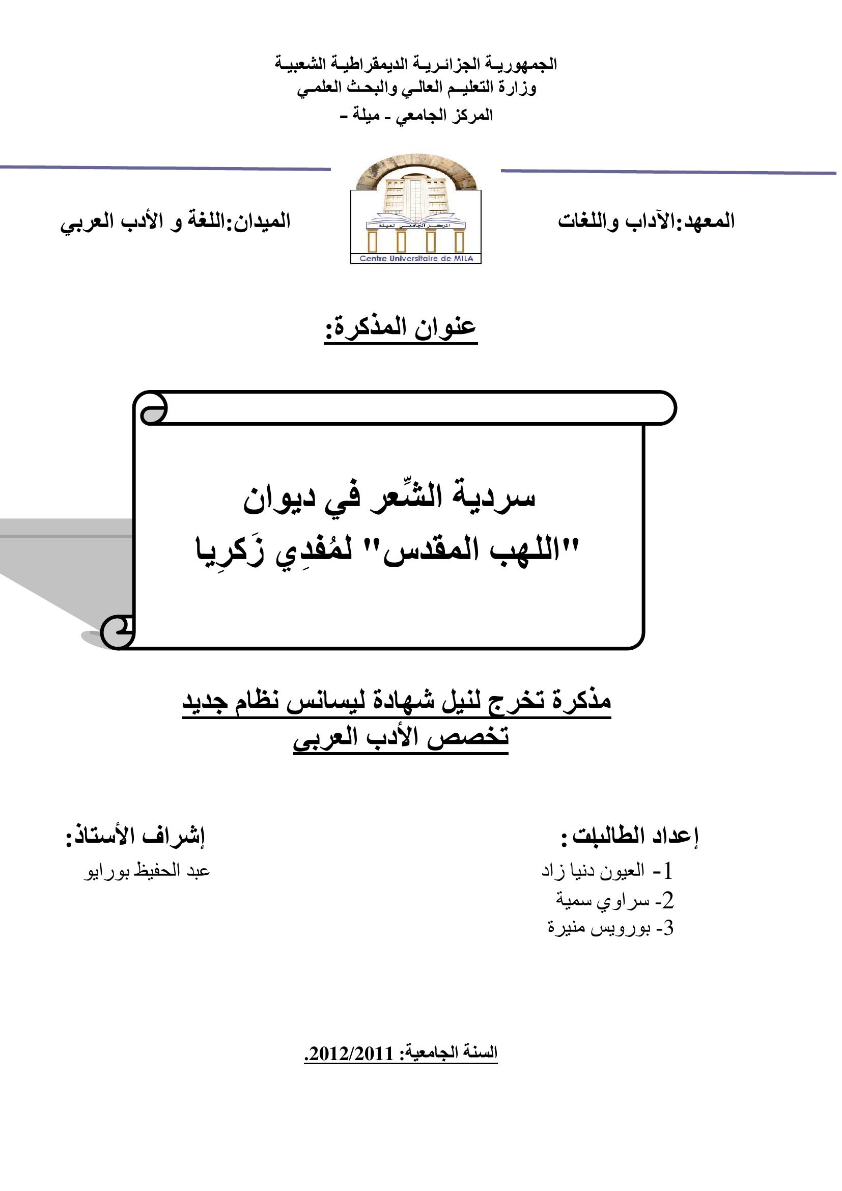 العيون دنيازاد et al. (2011). سردية الشعر في ديوان "اللهب المقدس" لمفدي زكريا.