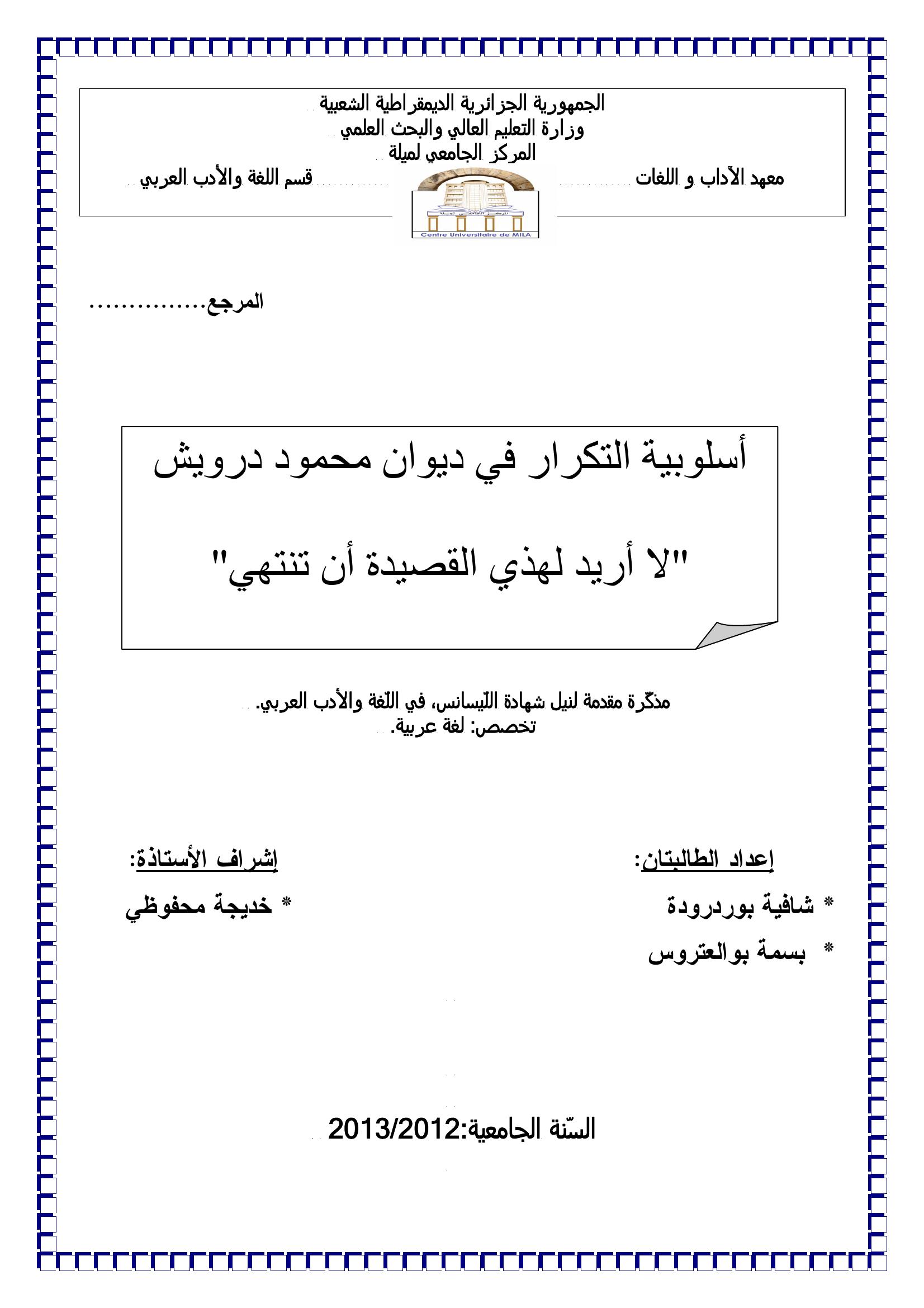 شافية بوردرودة et al. (2013). أسلوبية التكرار في ديوان محمود درويش " لا أريد لهذي القصيدة أن تنتهي ".