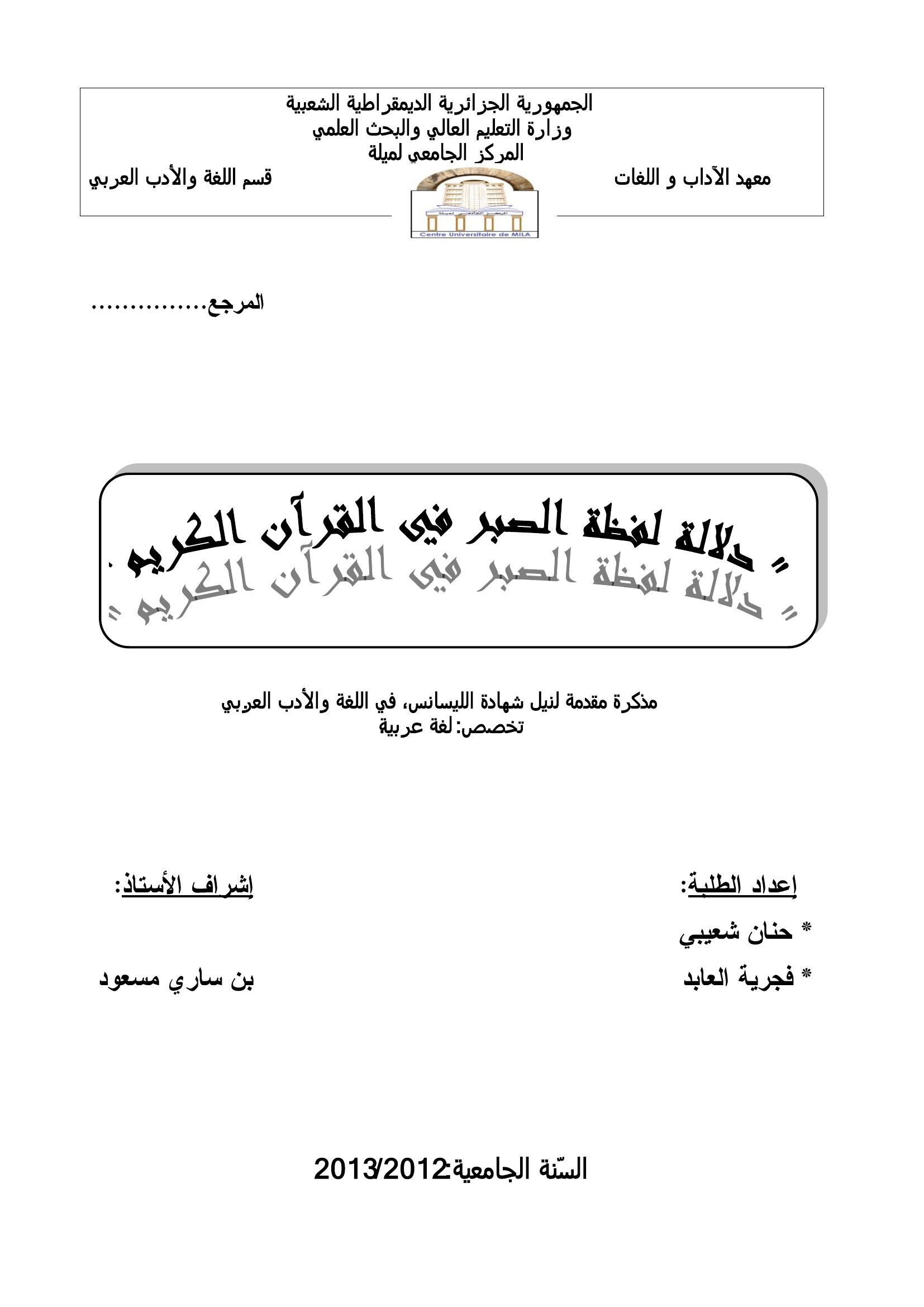 حنان شعيبي et al. (2013). دلالة لفظ الصبر في القران الكريم.