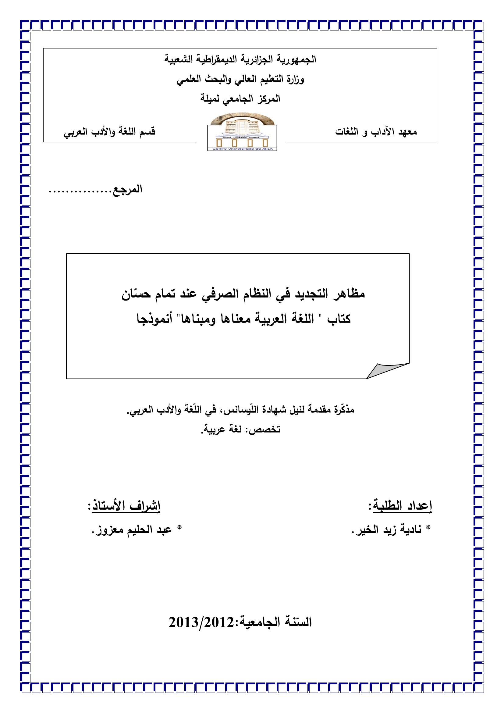 نادية زيد الخير(مشرفا) & معزوز عبد الحليم (مشرفا) (2013). مظاهر التجديد في النظام الصرفي عند تمام حسان كتاب "اللغة العربية معناها "أنموذجا.