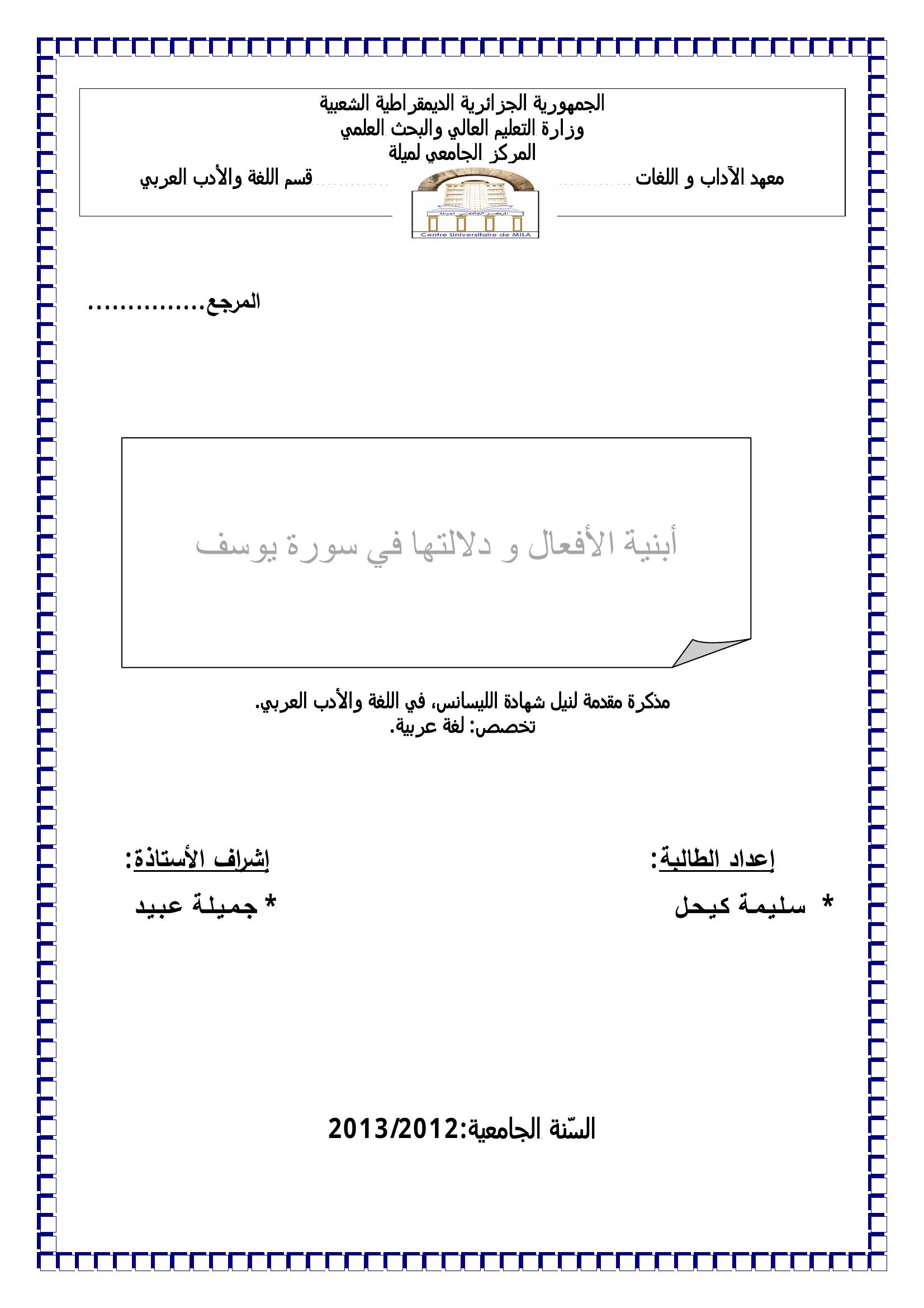 سليمة كيحل & عبيد جميلة (مشرفا) (2013). أبنية الأفعال و دلالتها في سورة يوسف.
