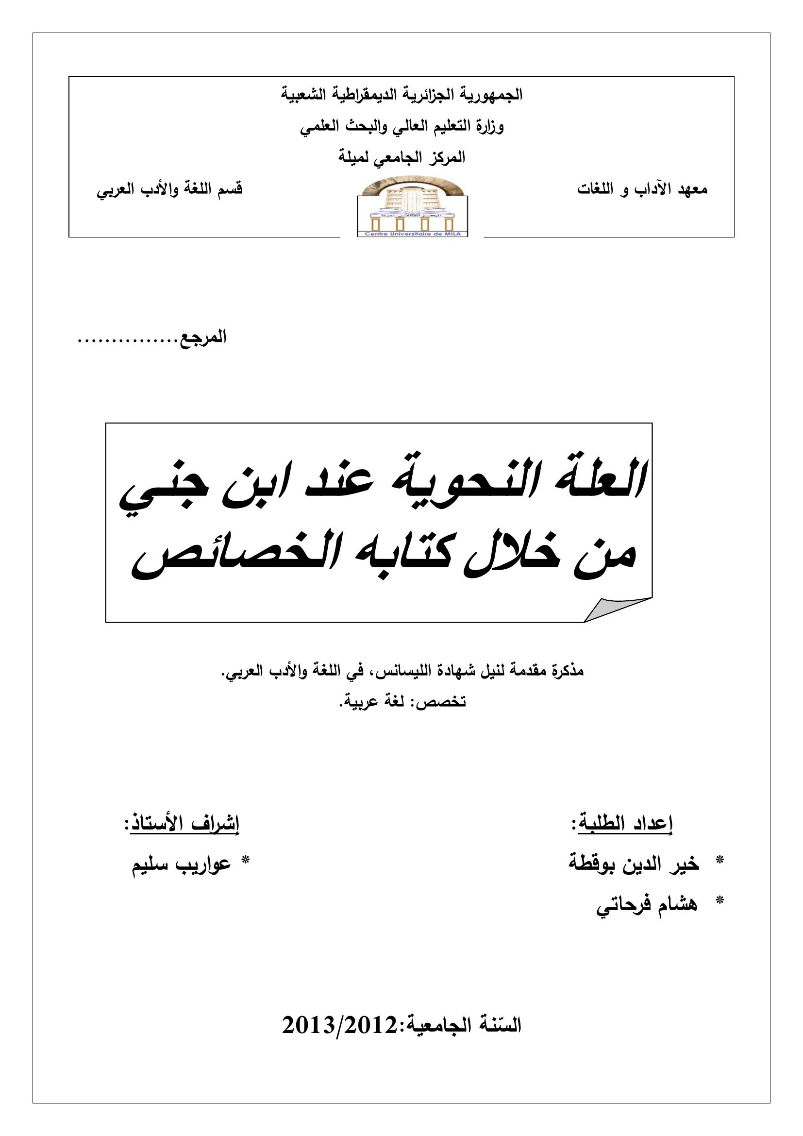 خير الدين بوقطة et al. (2013). العلة النحوية عند ابن جني من خلال كتابه الخصائص.
