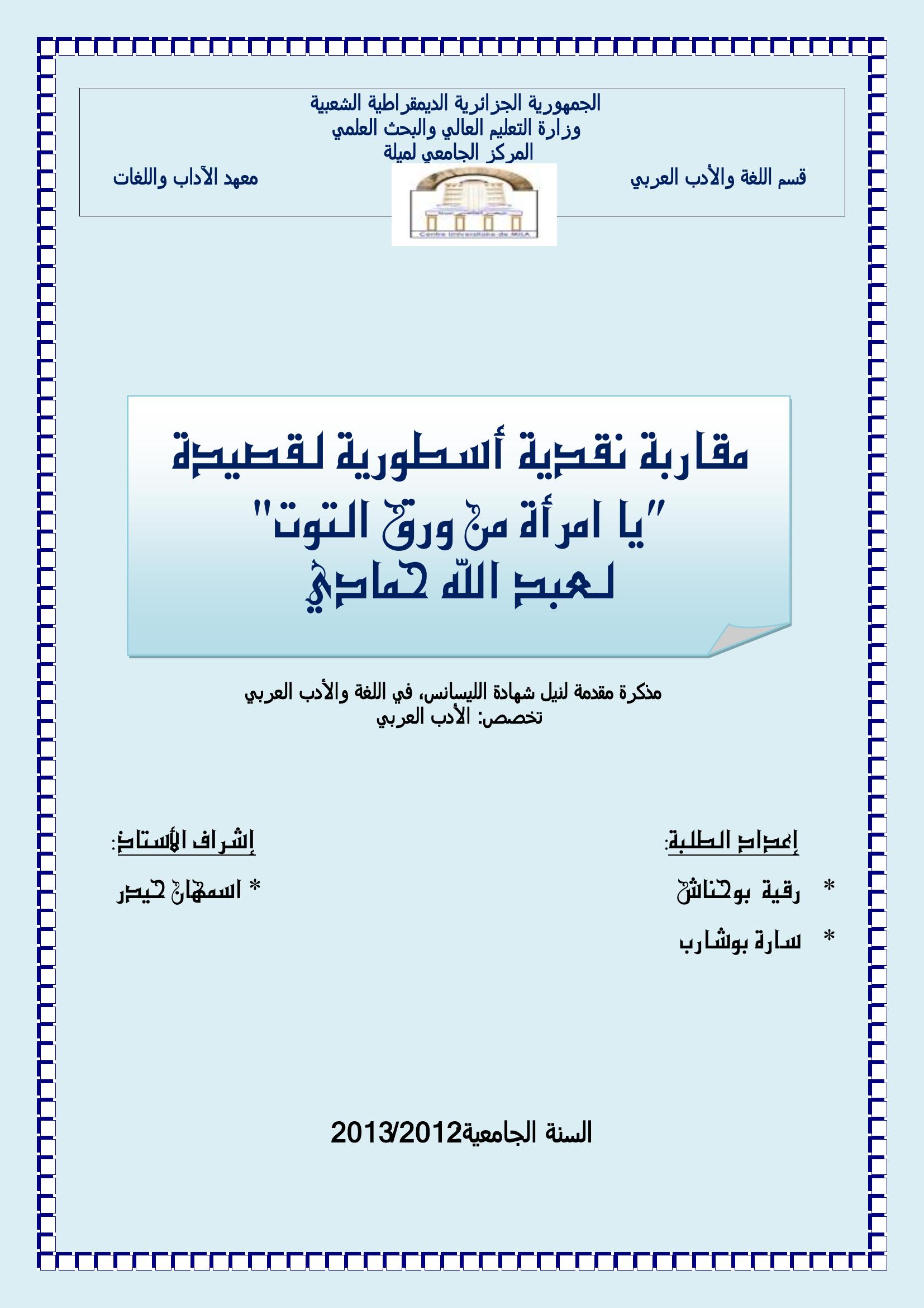 رقية بوحناش et al. (2013). مقاربة نقدية أسطورية لقصيدة "يا امراة من ورق التوت" لعبد الله حمادي.