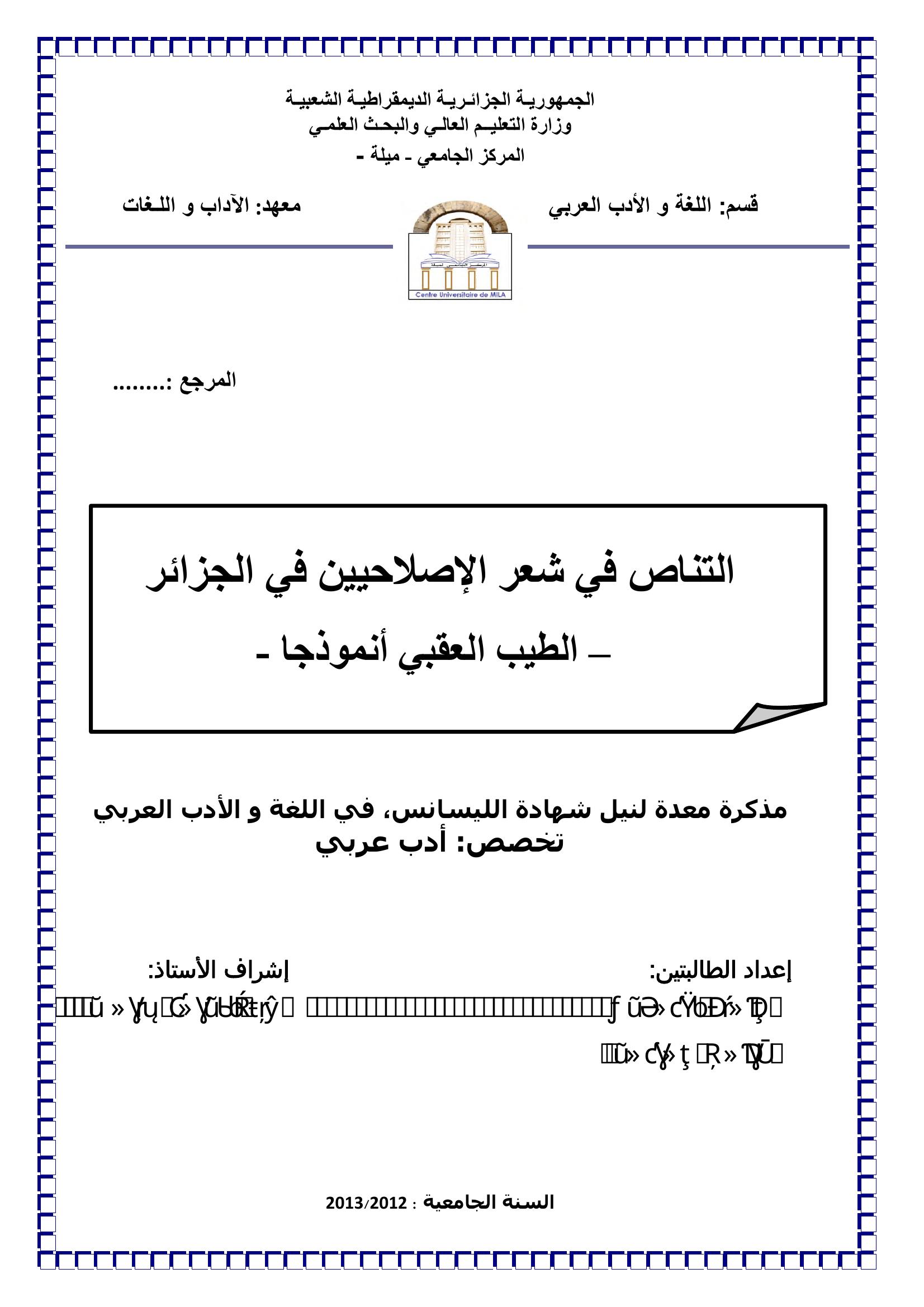 حنان لعموري et al. (2013). التناص في شعر الإصلاحيين في الجزائر الطيب العقبي أنموذجا.
