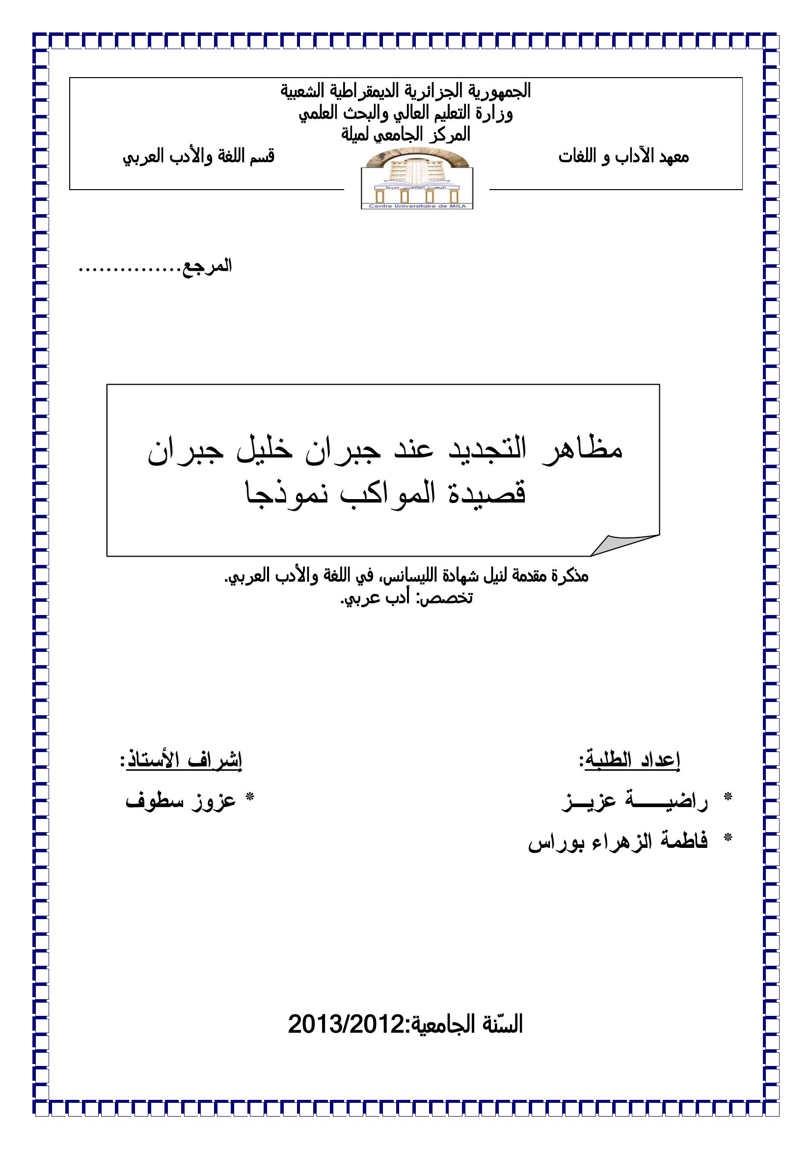 راضية عزيز et al. (2013). مظاهر التجديد عند جبران خليل جبران قصيدة المواكب نموذجا.