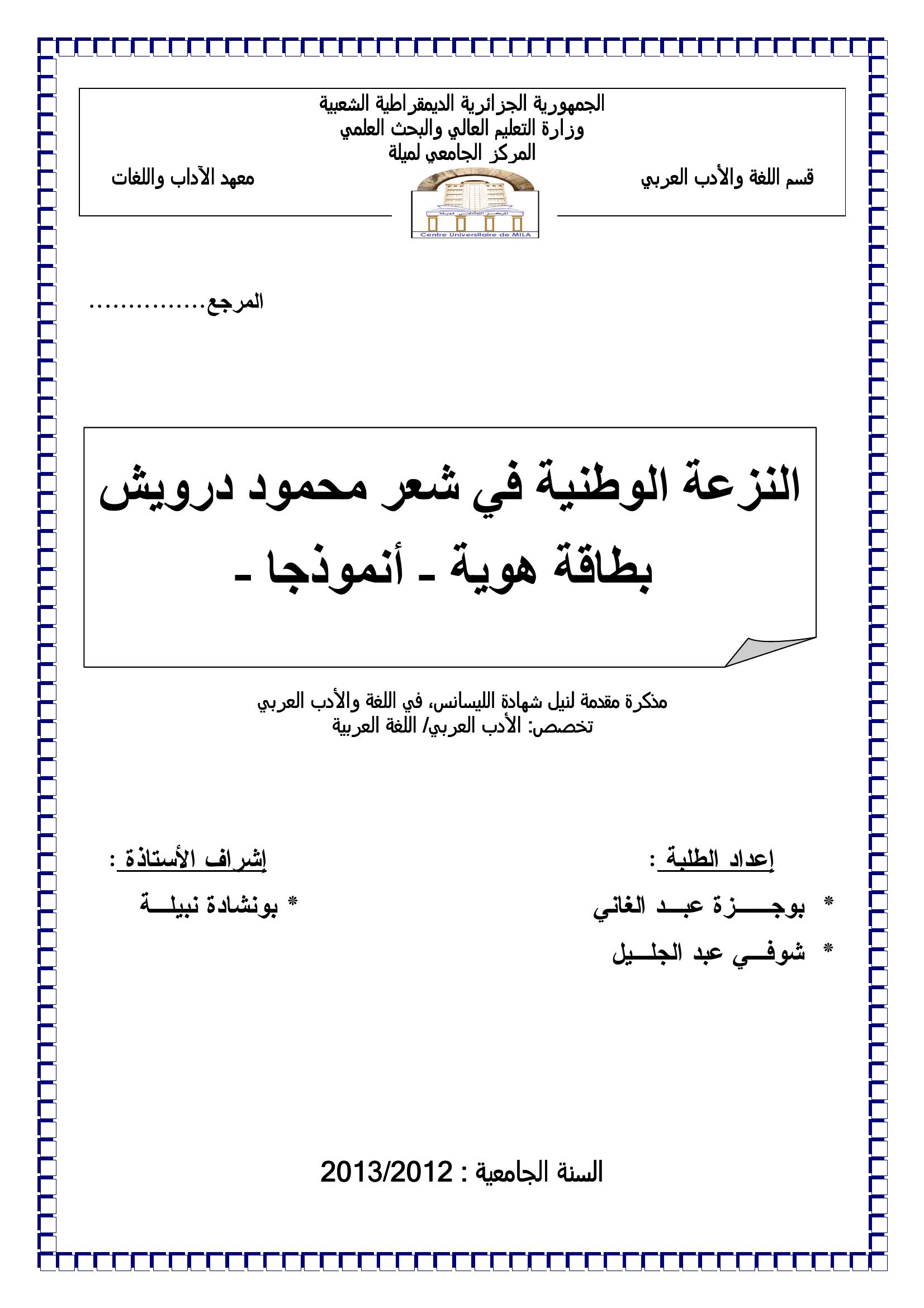 بوجزة عبد الغاني et al. (2013). النزعة الوطنية في شعر محمود درويش بطاقة هوية - أنموذجا-.
