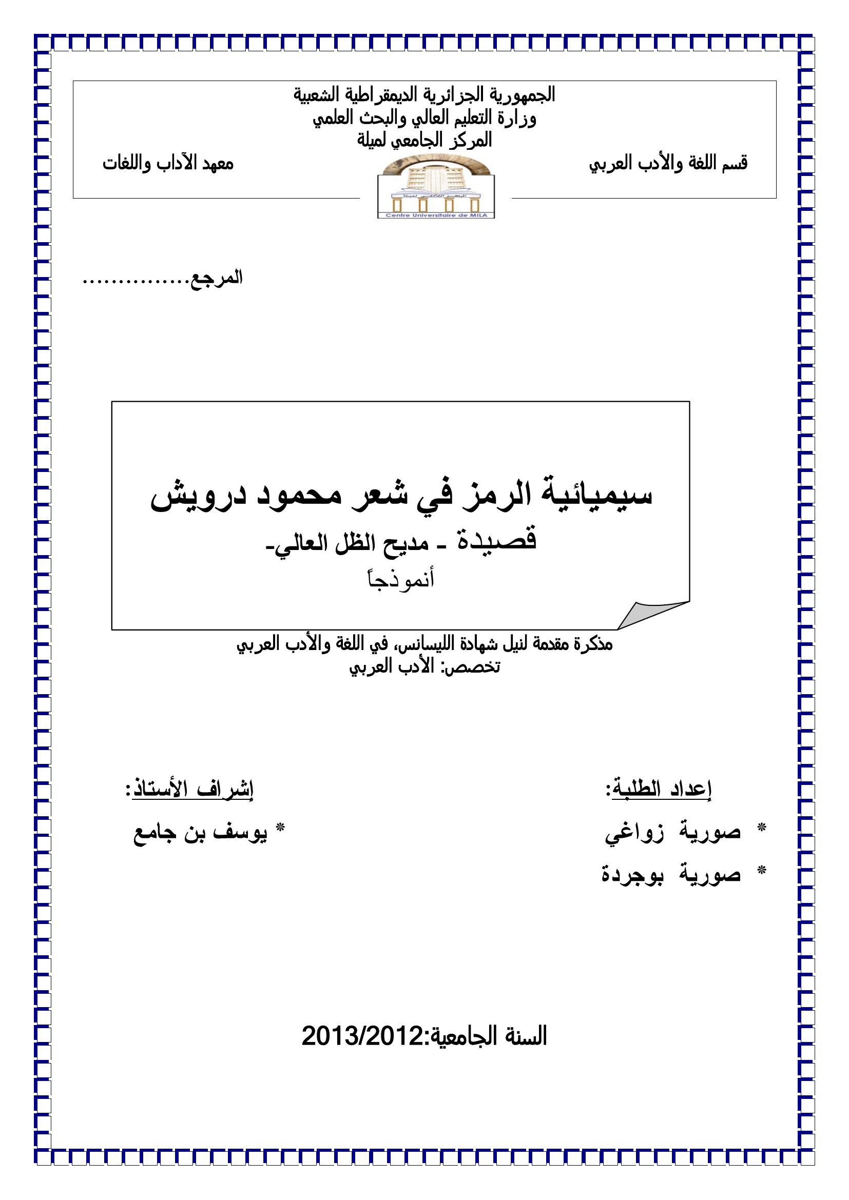 صورية زواغي et al. (2013). سيميائية الرمز في شعر محمود درويش قصيدة - مديح الظل العالي - أنموذجا -.