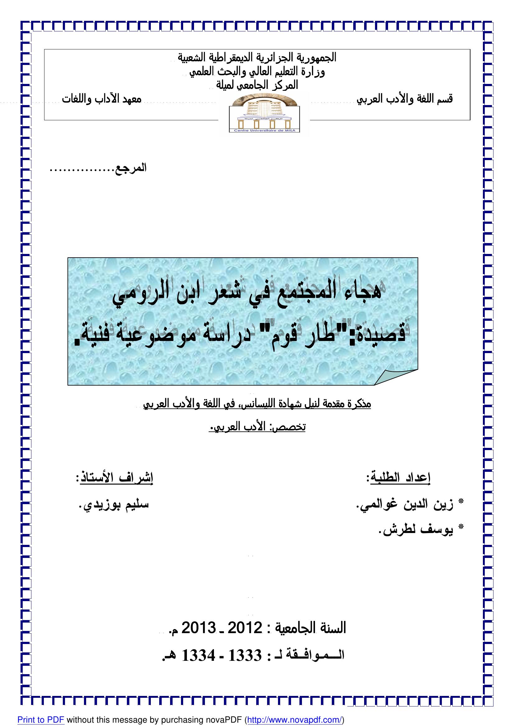 زين الدين غوالمي et al. (2013). هجاء المجتمع في شعر ابن الرومي قصيدة "طار قوم "دراسة موضوعية فنية.