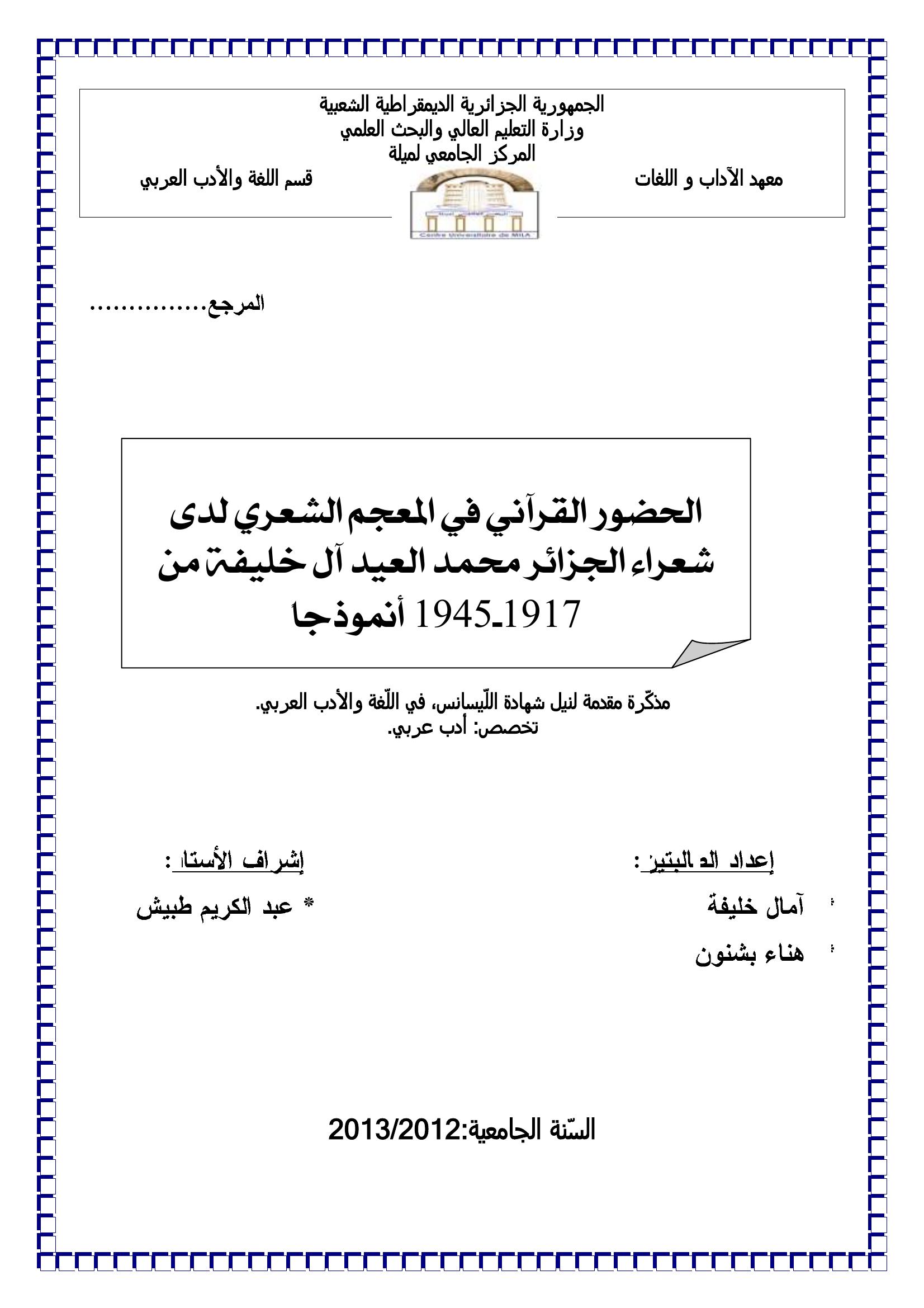 أمال خليفة et al. (2013). الحضور القراني في المعجم الشعري لدى شعراء الجزائر محمد العيد أل خليفة من 1917 - 1945 أنمزذجا.