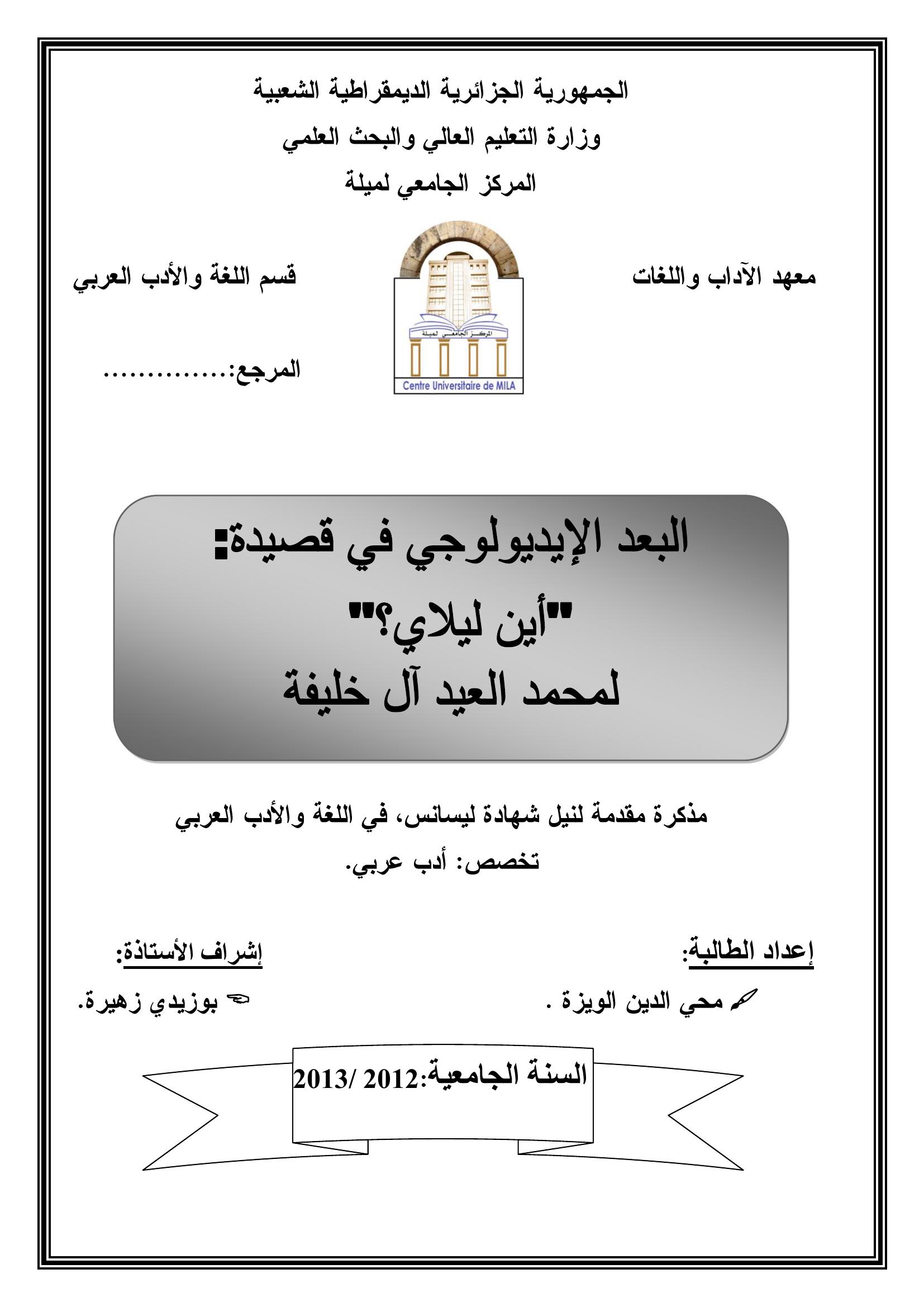 محي الدين الويزة & بوزيدي زهيرة (مشرفا) (2013). البعد الإيديولوجي في قصيدة : "أين ليلاي؟ " لمحمد العيد ال خليفة.