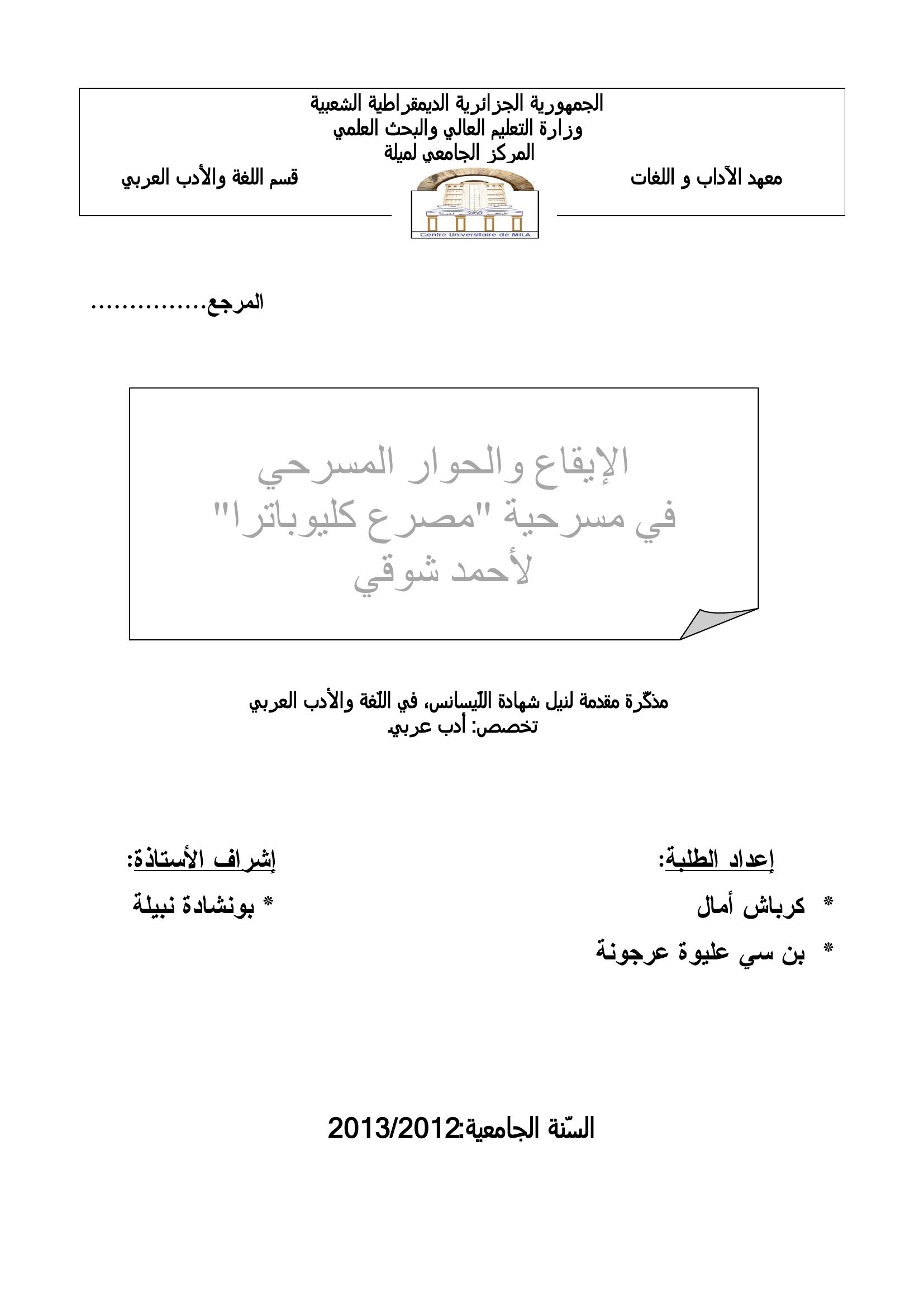 كرباش أمال et al. (2013). الإيقاع والحوار المسرحي في مسرحية " مصرع كليوباترا ".