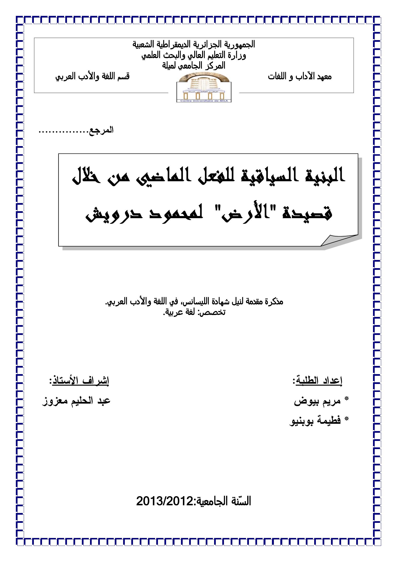 مريم بيوض et al. (2013). البنية السياقية للفعل الماضي من خلال قصيدة " الأرض " لمحمود درويش.
