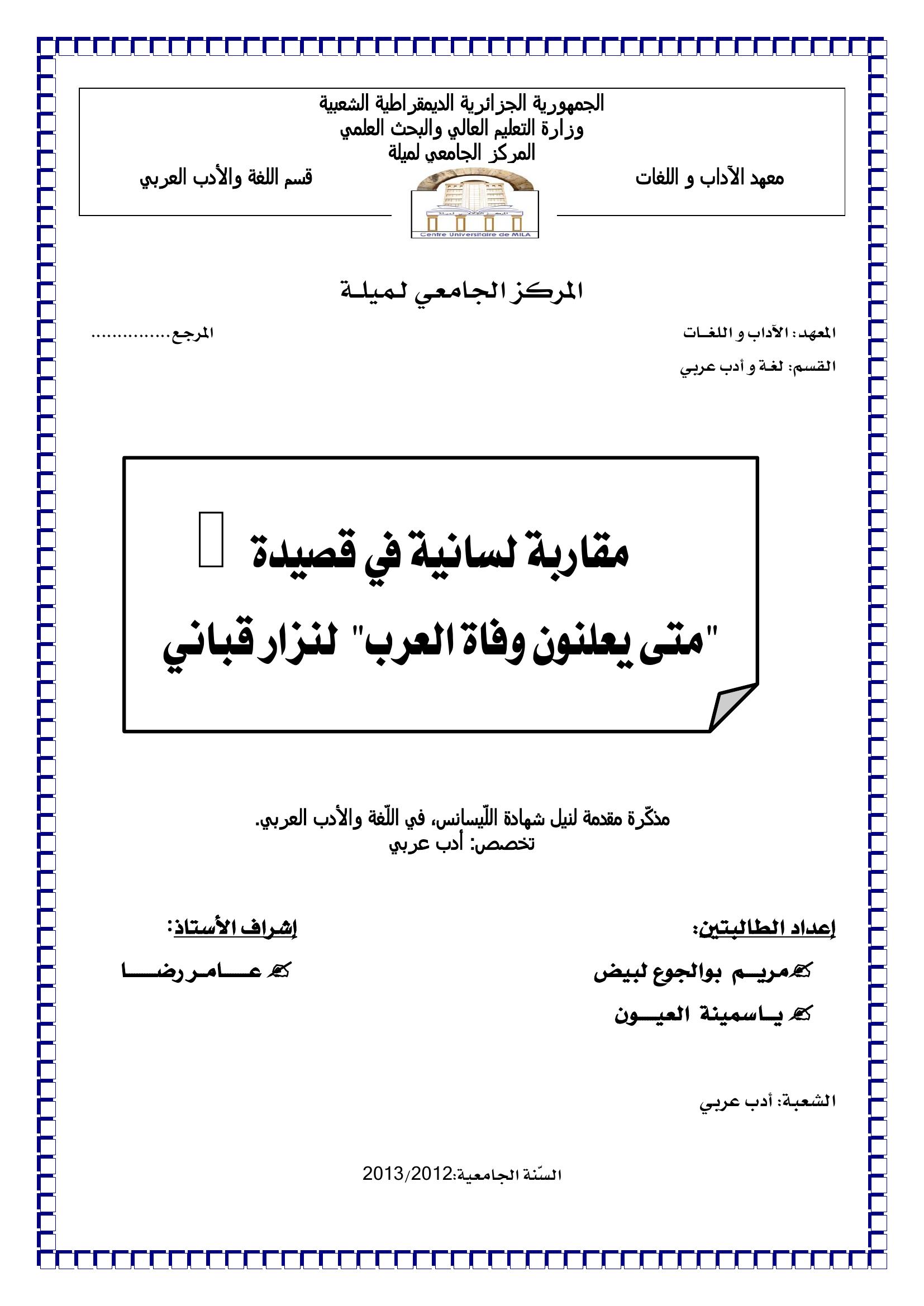 مريم بوالجوع لبيض et al. (2013). مقاربة لسانية في قصيدة " متى يعلنون وفاة العرب " لنزار قباني.