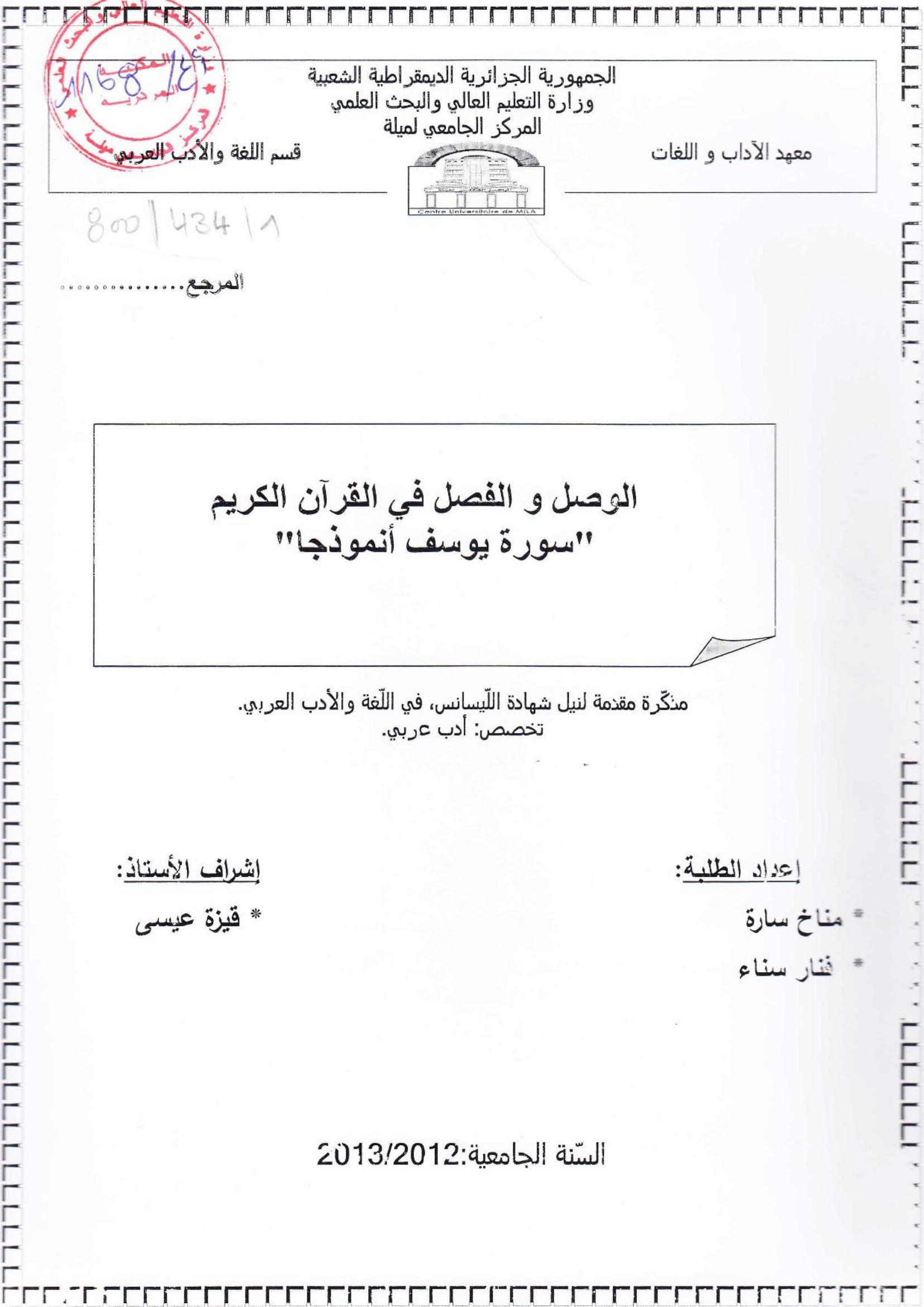 مناخ سارة et al. (2013). الوصل والفصل في القران الكريم سورة يوسف أنموذجا.