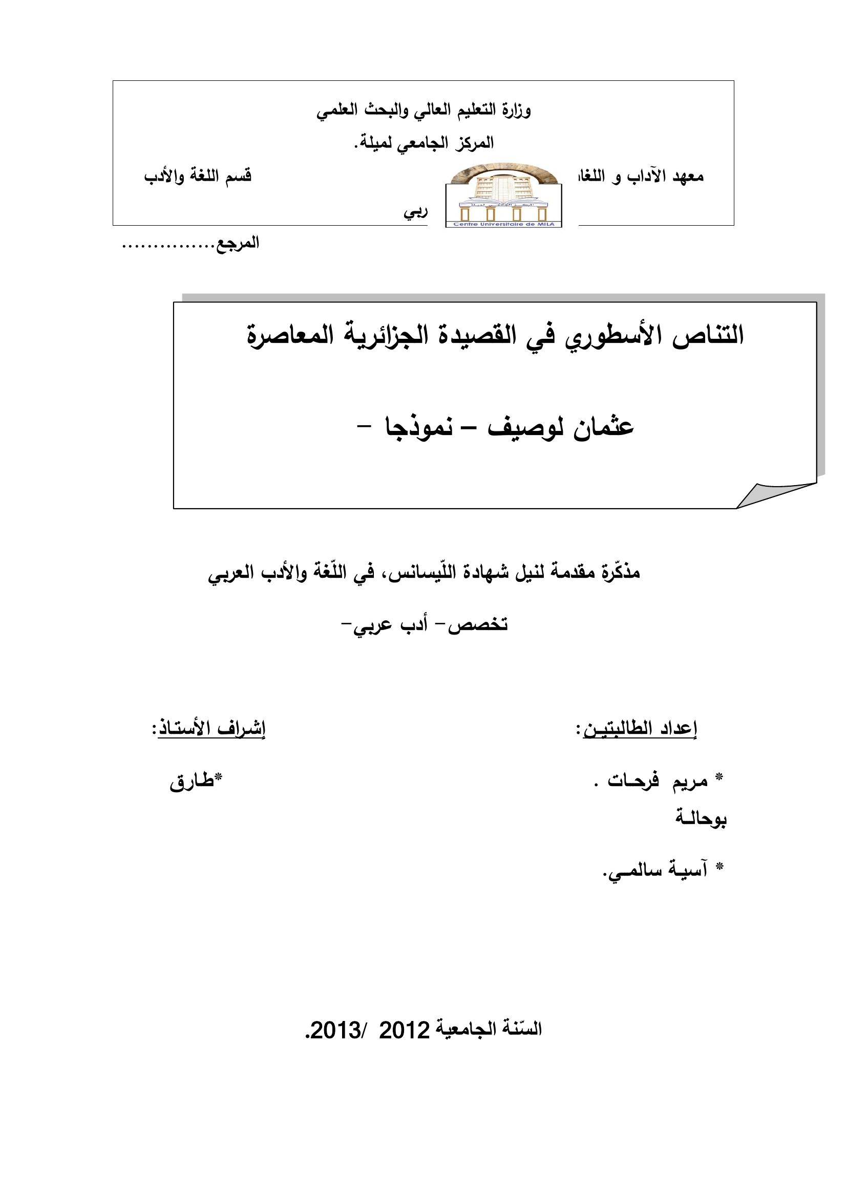 مريم فرحات et al. (2013). التناص الأسطوري في القصيدة الجزائرية المعاصرة عثمان لوصيف أنموذجا.