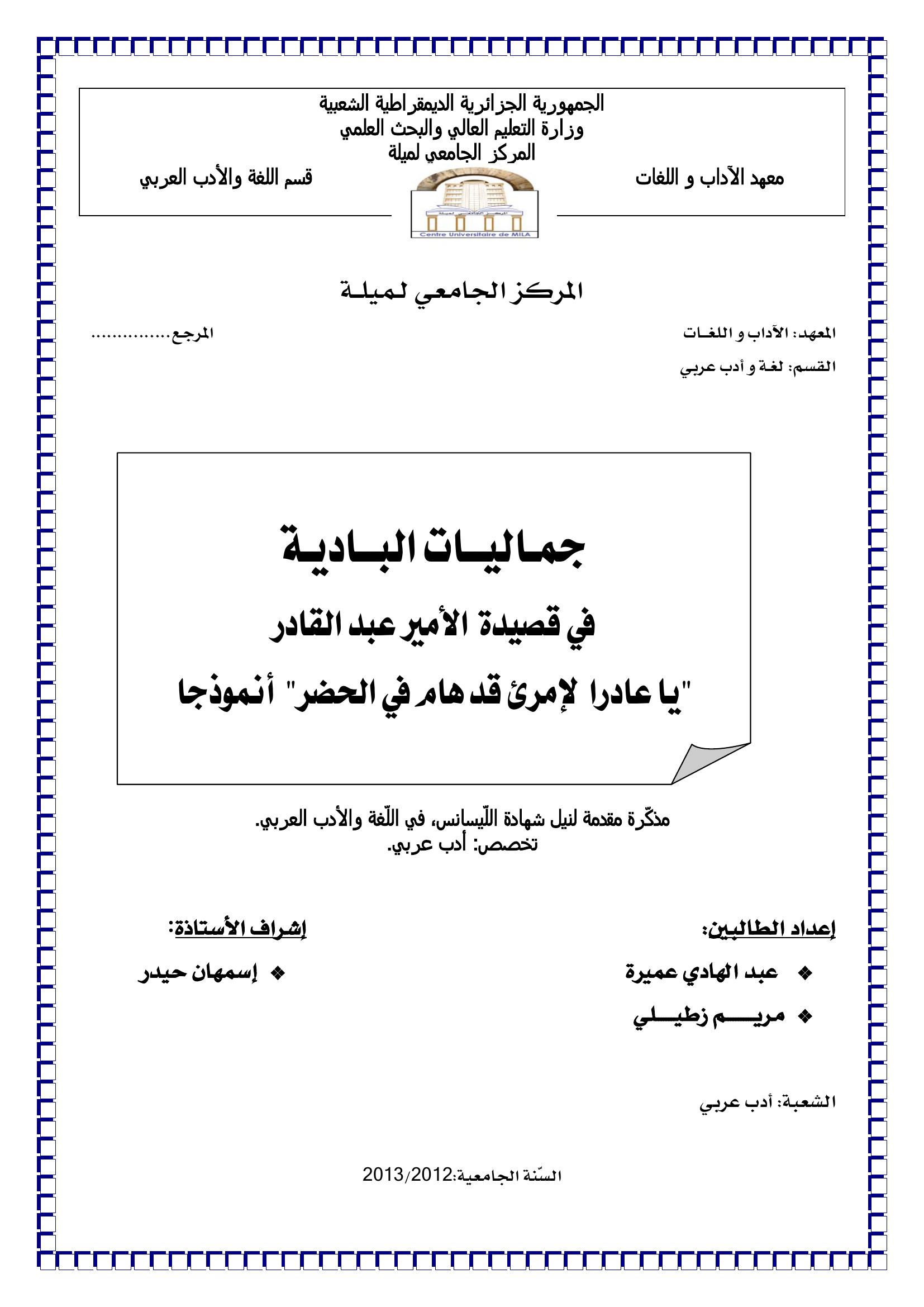 عبد الهادي عميرة et al. (2013). جماليات البادية في قصيدة الأمير عبد القادر يا عادرا لإمرئ قد هام في الحضر " أنموذجا".
