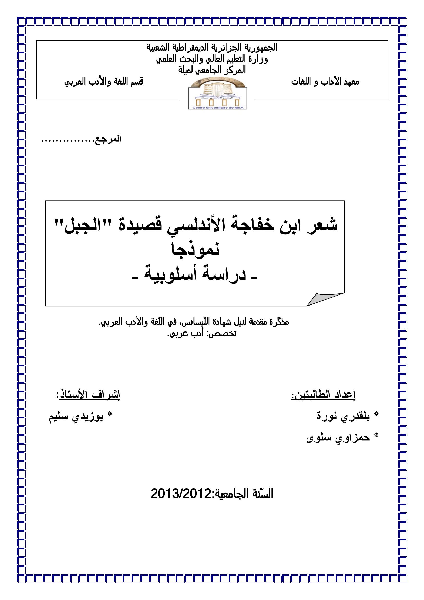 بلقدري نورة et al. (2013). شعر ابن خفاجة الأندلسي قصيدة " الجبل " نموذجا دراسة أسلوبية.