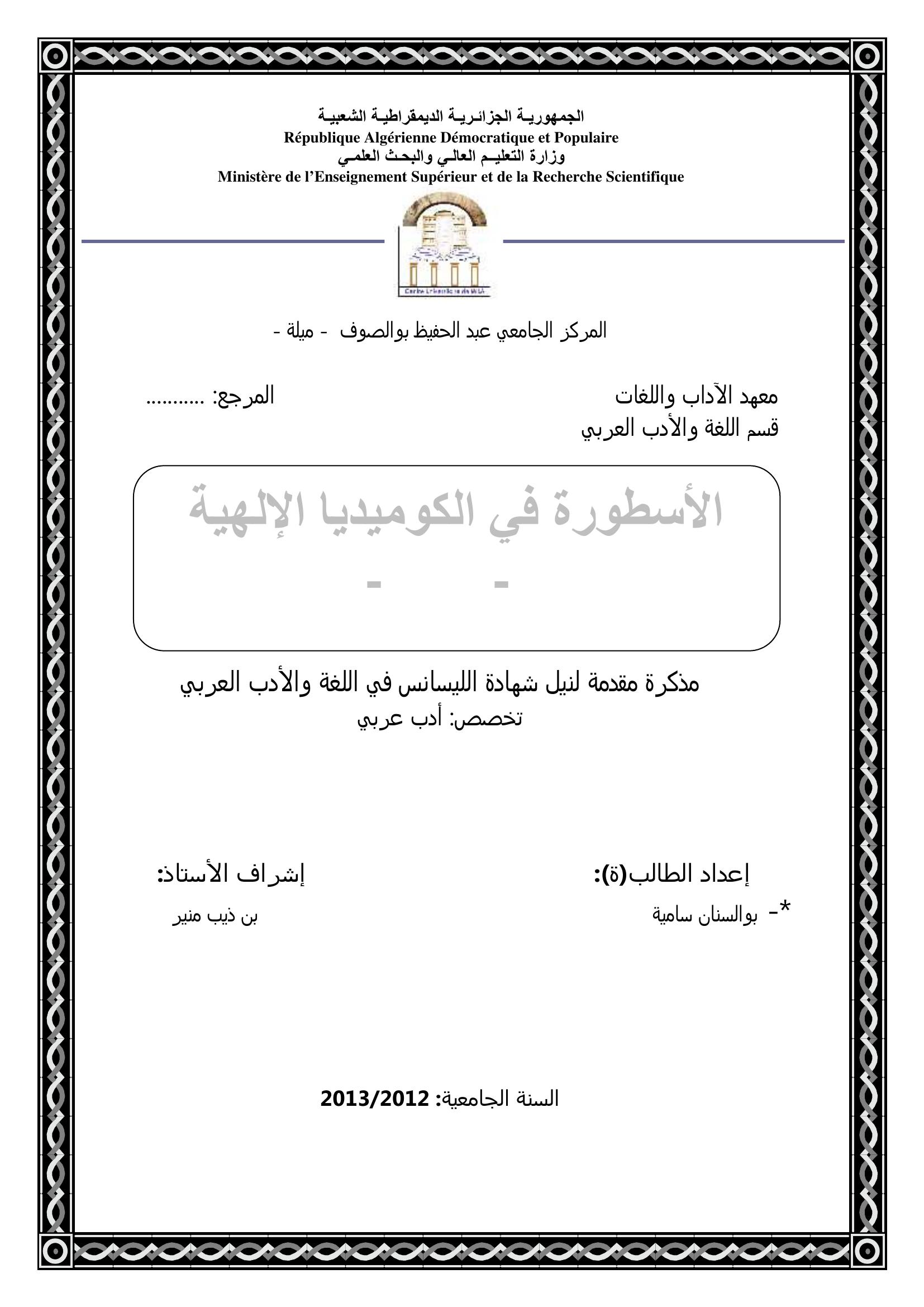 بولسنان سامية & بن الذيب منير( مشرفا) (2013). الأسطورة في الكوميديا الإلهية لدانتي الجحيم أنموذجا.