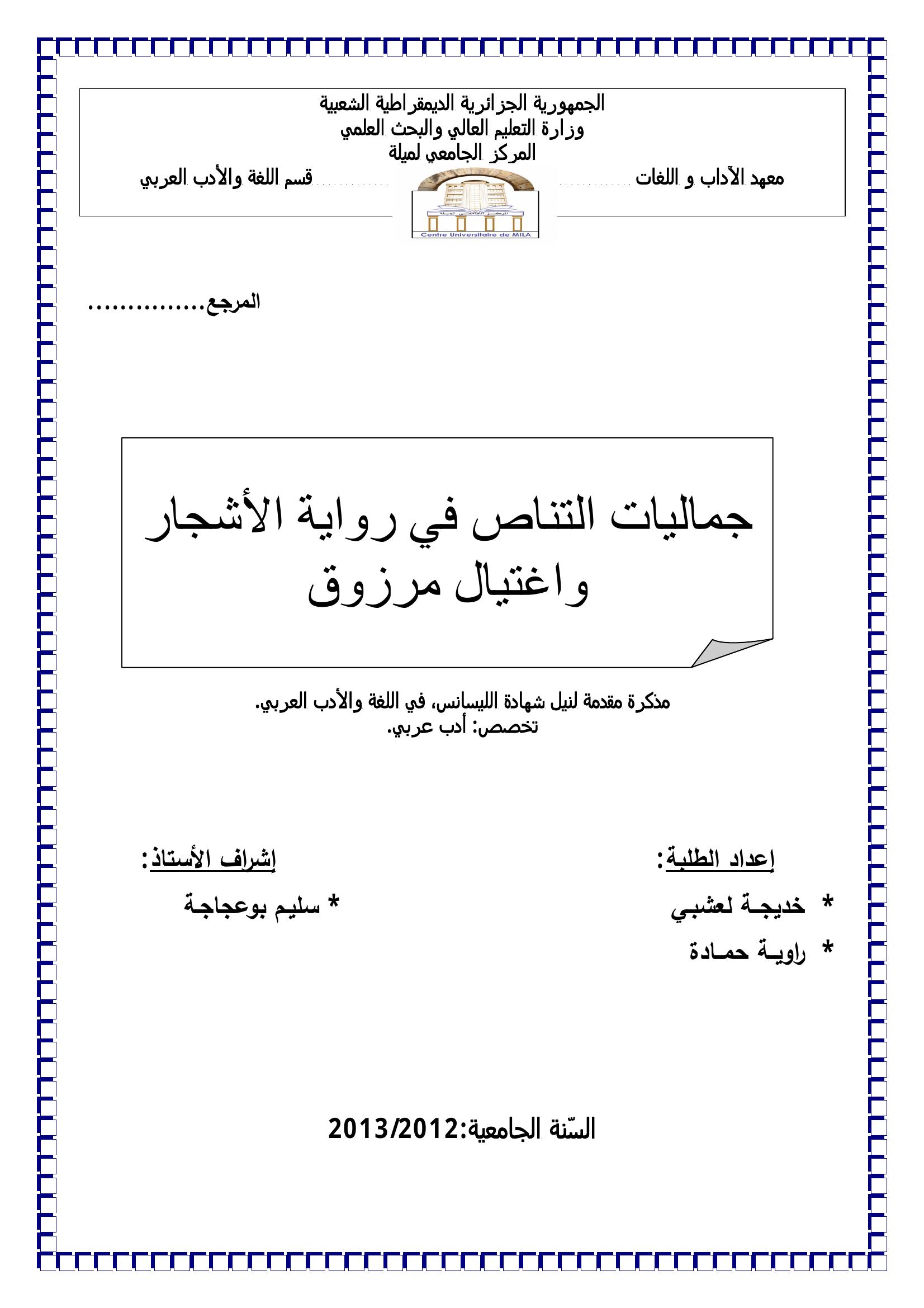 خديجة لعشبي et al. (2013). جماليات التناص في رواية الأشجار واغتيال مرزوق.