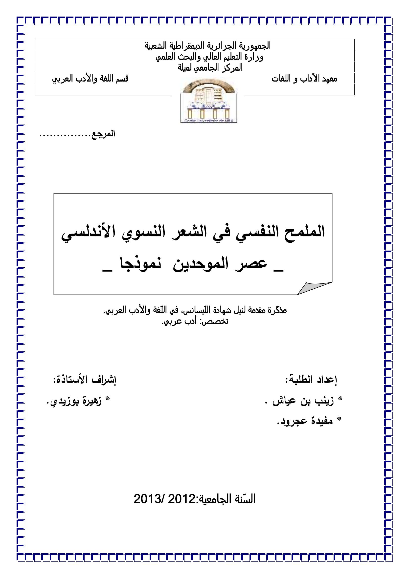 زينب بن عياش et al. (2013). الملمح النفسي في الشعر النسوي الأندلسي عصر الموحدين نموذجا.