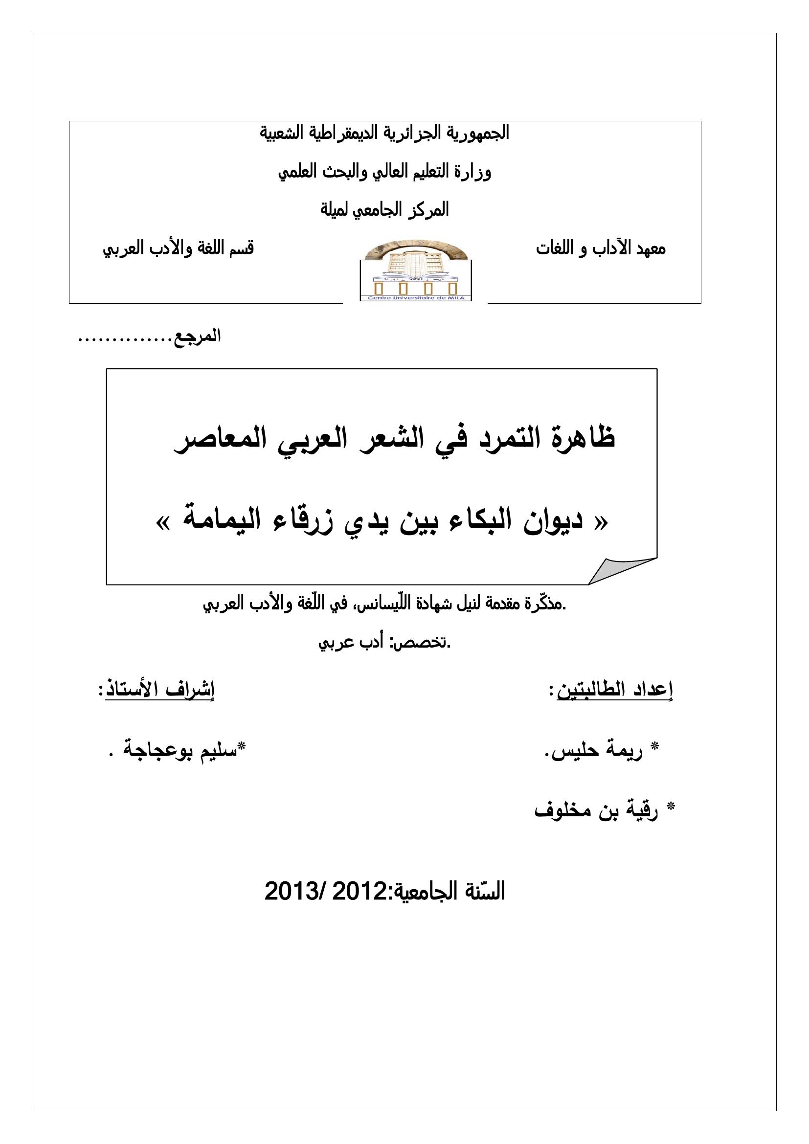 ريمة حليس et al. (2013). ظاهرة التمرد في الشعر العربي المعاصر ديوان البكاء بين يدي زرقاء اليمامة أنموذجا.