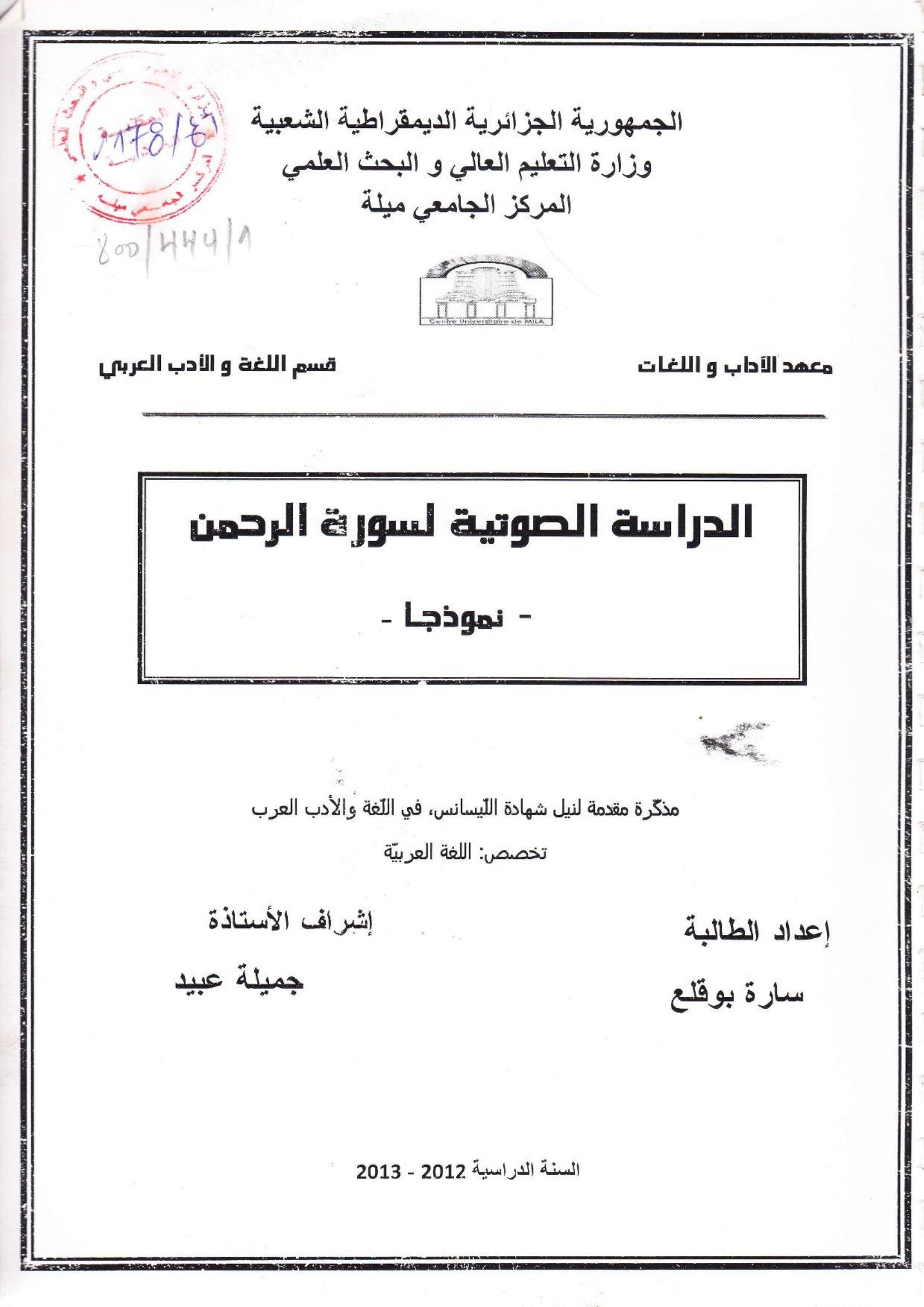 سارة بوقلع & عبيد جميلة (مشرفا) (2013). الدراسة الصوتية لسورة الرحمن نموذجا.