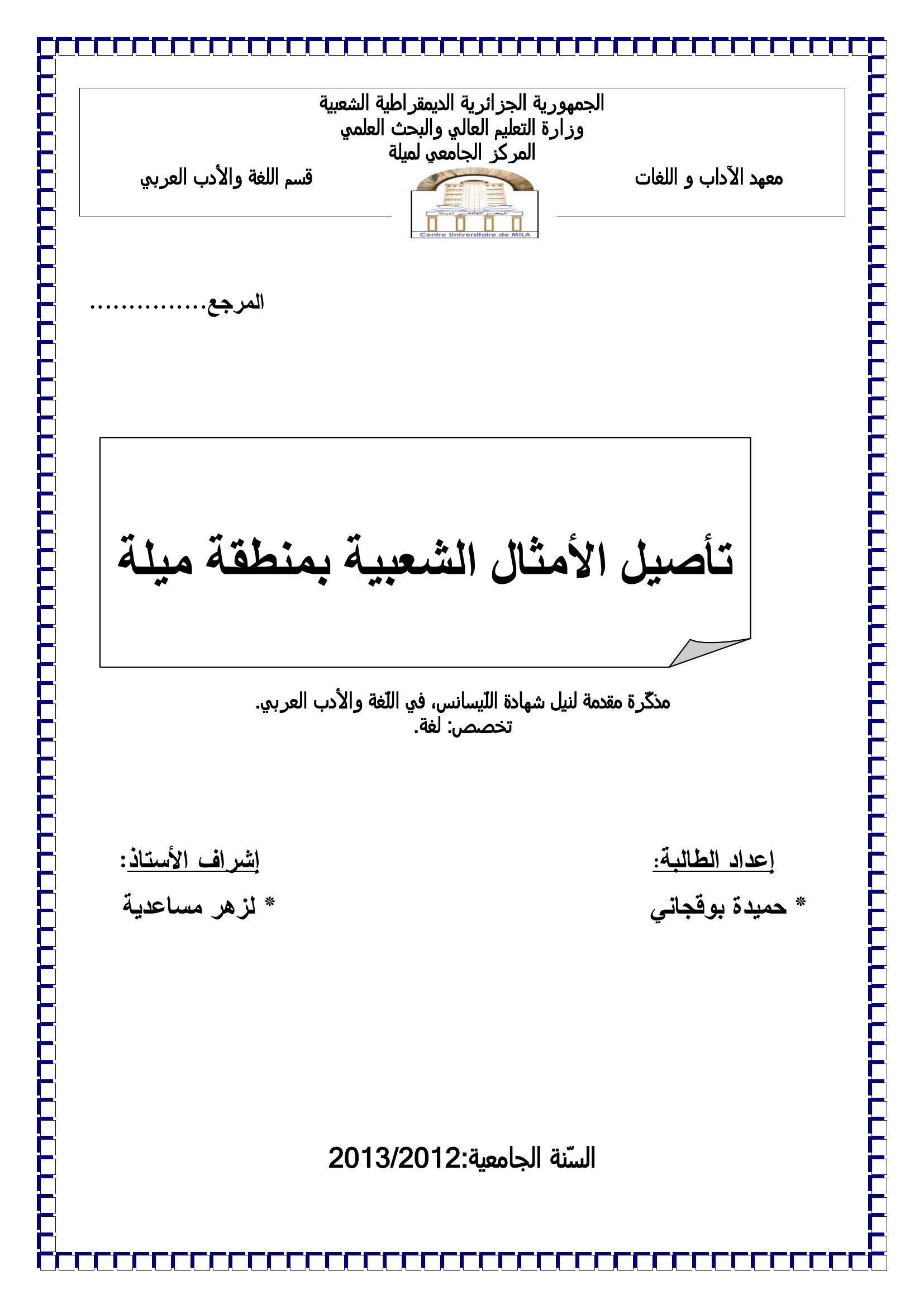 حميدة بوقجاني & مساعدية لزهر (مشرفا) (2013). تأصيل الأمثال الشعبية بمنطقة ميلة.