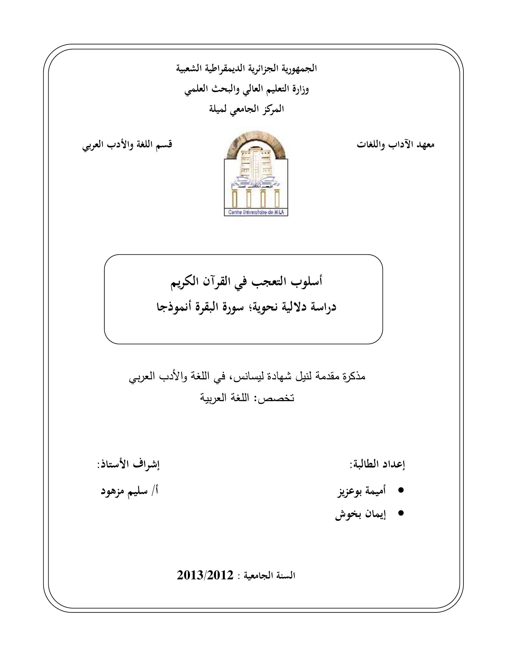 أميمة بوعزيز et al. (2013). أسلوب التعجب في القرآن الكريم دراسة دلالية نحوية سورة البقرة أنموذجا.