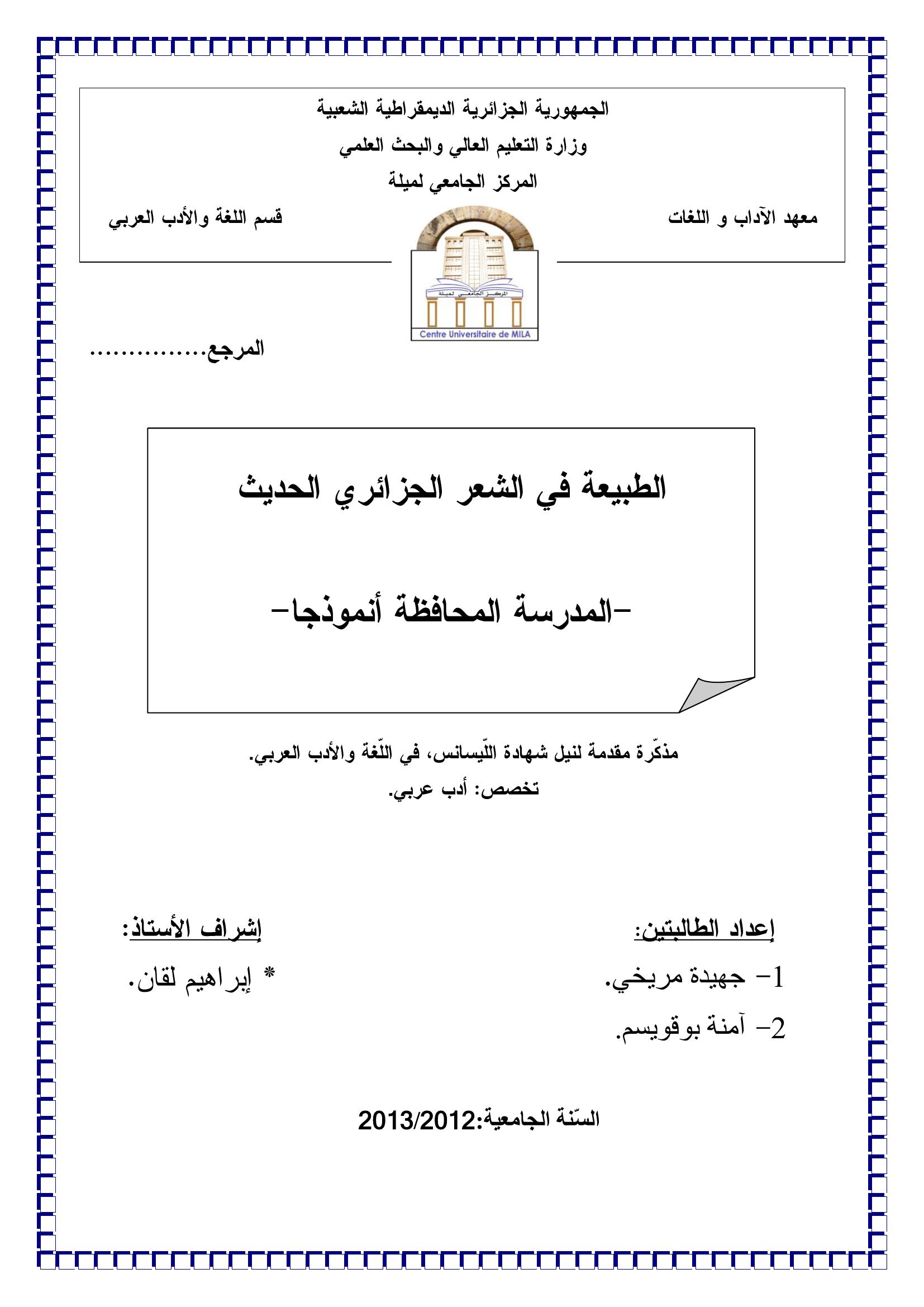 جهيدة مريخي et al. (2013). الطبيعة في الشعر الجزائري الحديث المدرسة المحافظة أنموذجا.
