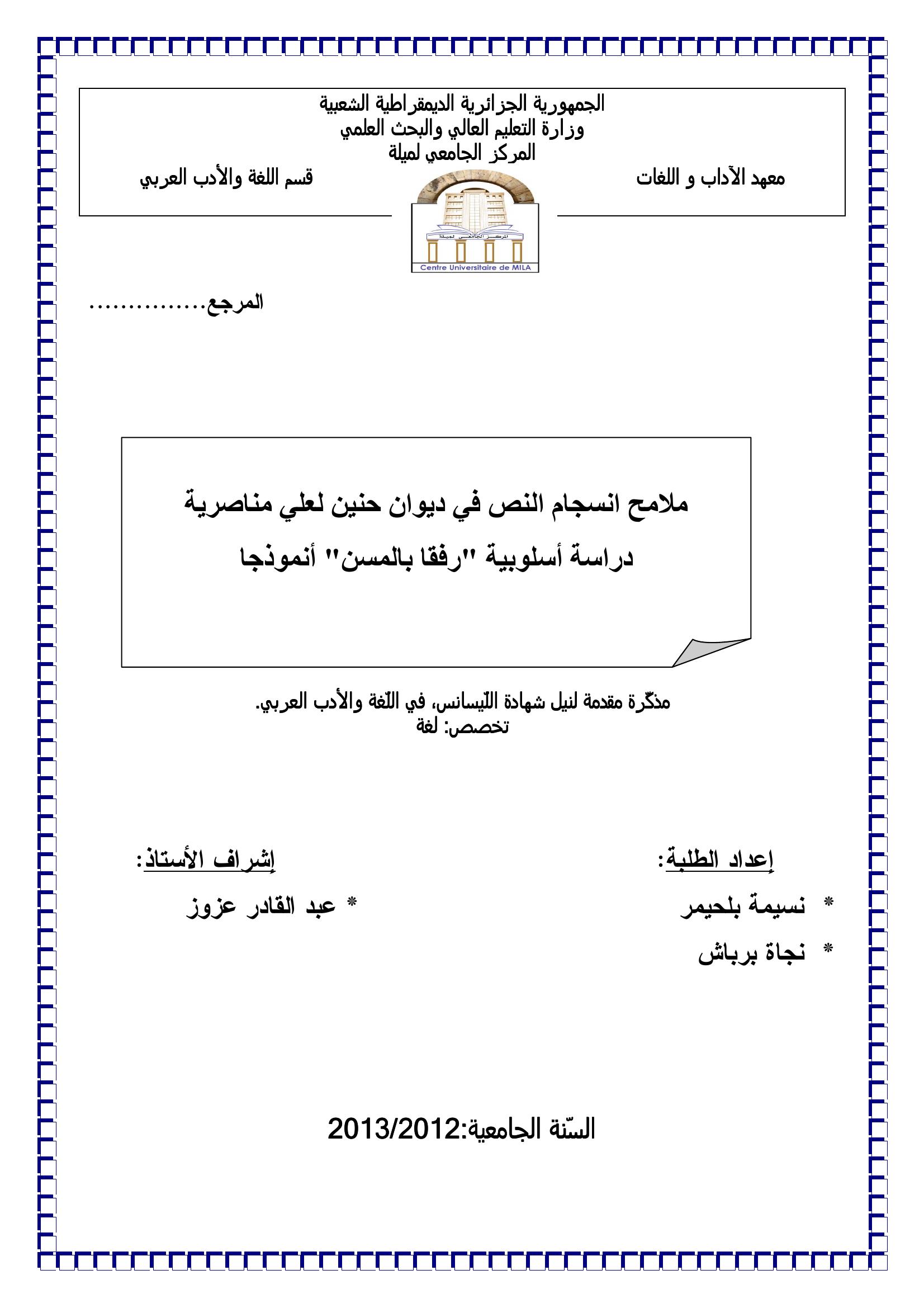 نسيمة بلحيمر et al. (2013). ملامح انسجام النص في ديوان حنين لعلي مناصرية دراسة أسلوبية " رفقا بالمسن " أنموذجا.
