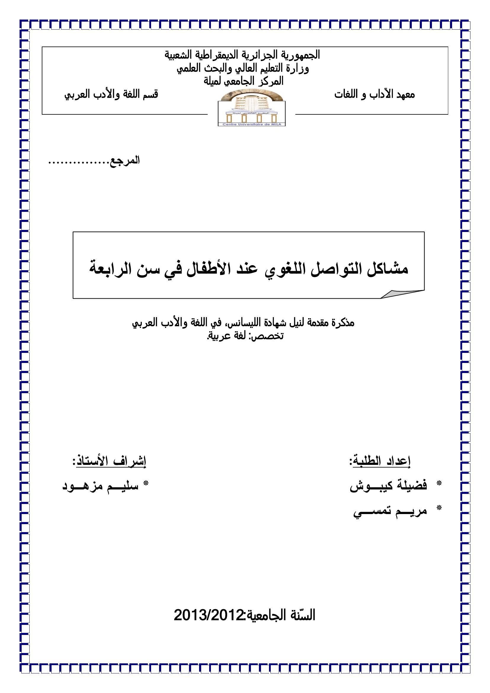 فضيلة كيبوش et al. (2013). مشاكل التواصل اللغوي عند الاطفال في سن الرابعة.