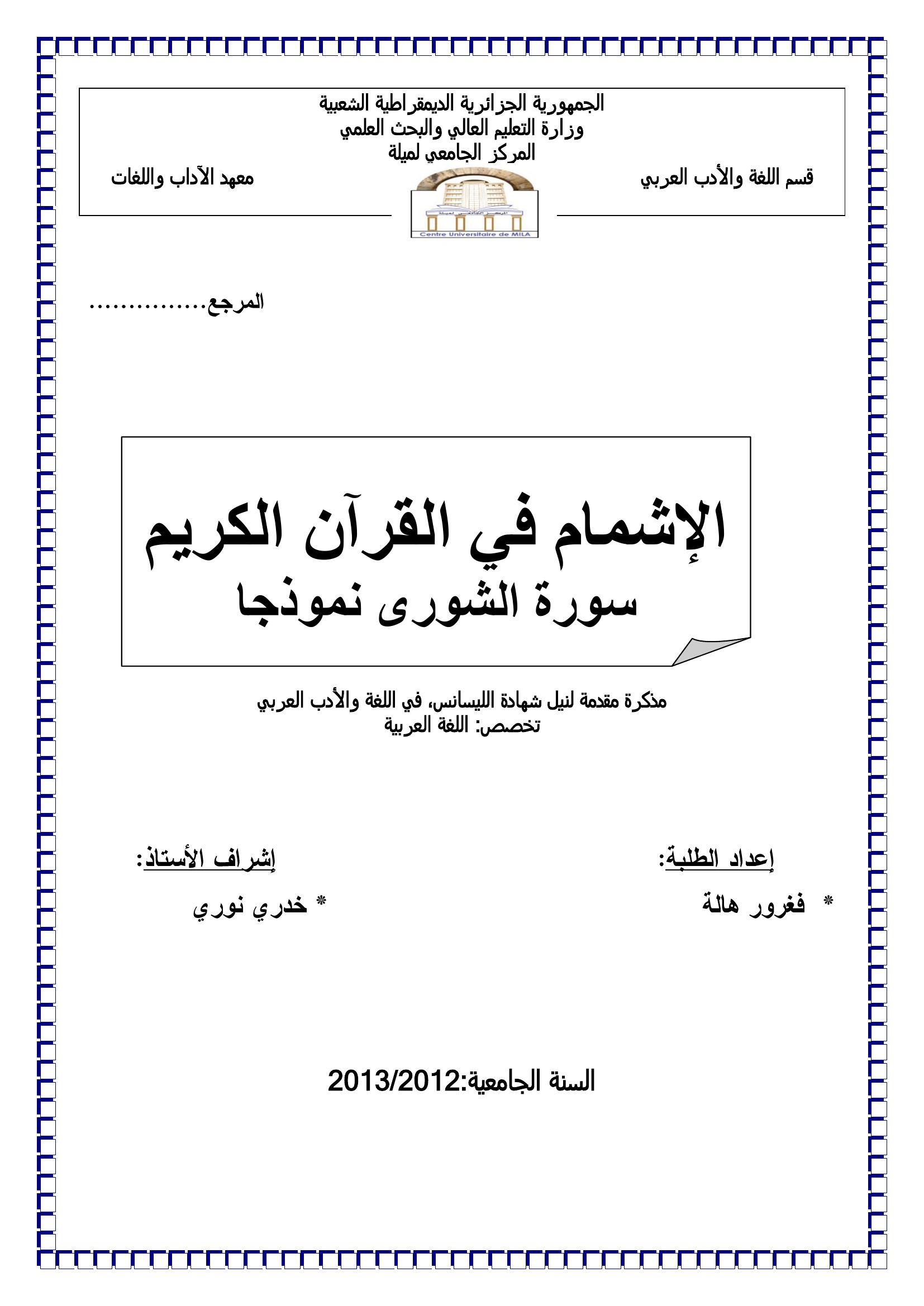 فغرور هالة & خذري نوري (مشرفا) (2013). الإشمام في القرآن الكريم سورة الشورى نموذجا.