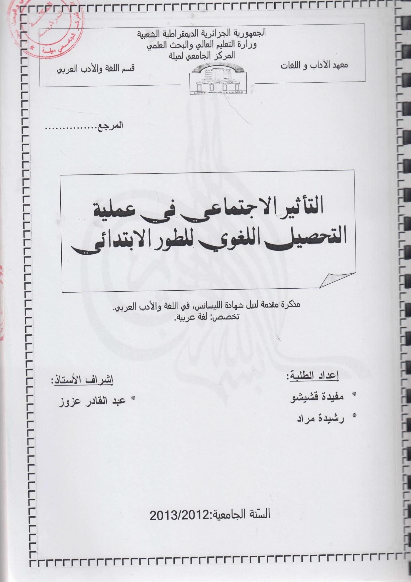 مفيدة قشيشو et al. (2013). التأثير الاجتماعي في عملية التحصيل اللغوي للطور الابتدائي.