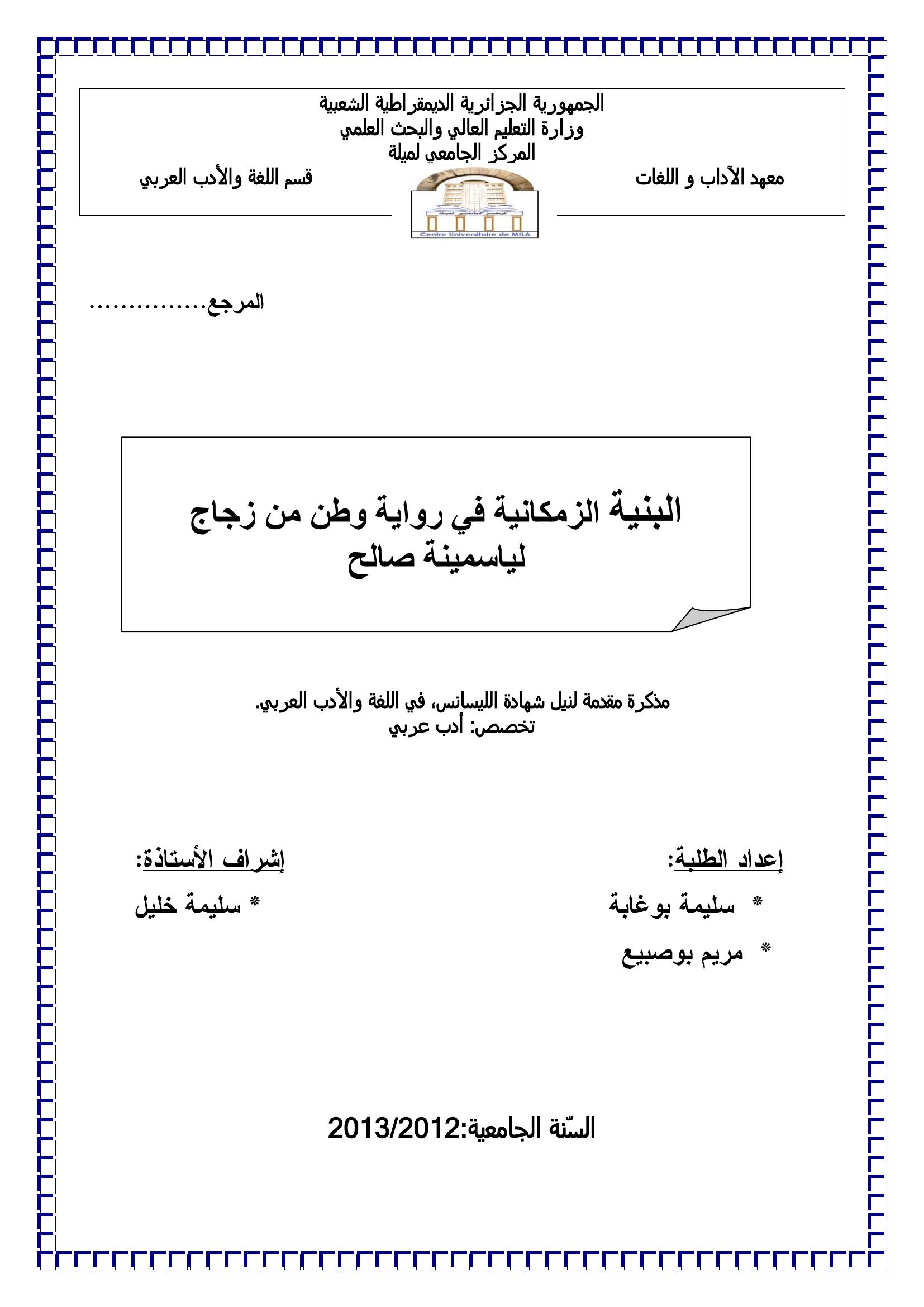 سليمة بوغابة et al. (2013). البنية الزمكانية في رواية وطن من زجاج لياسمينة صالح.