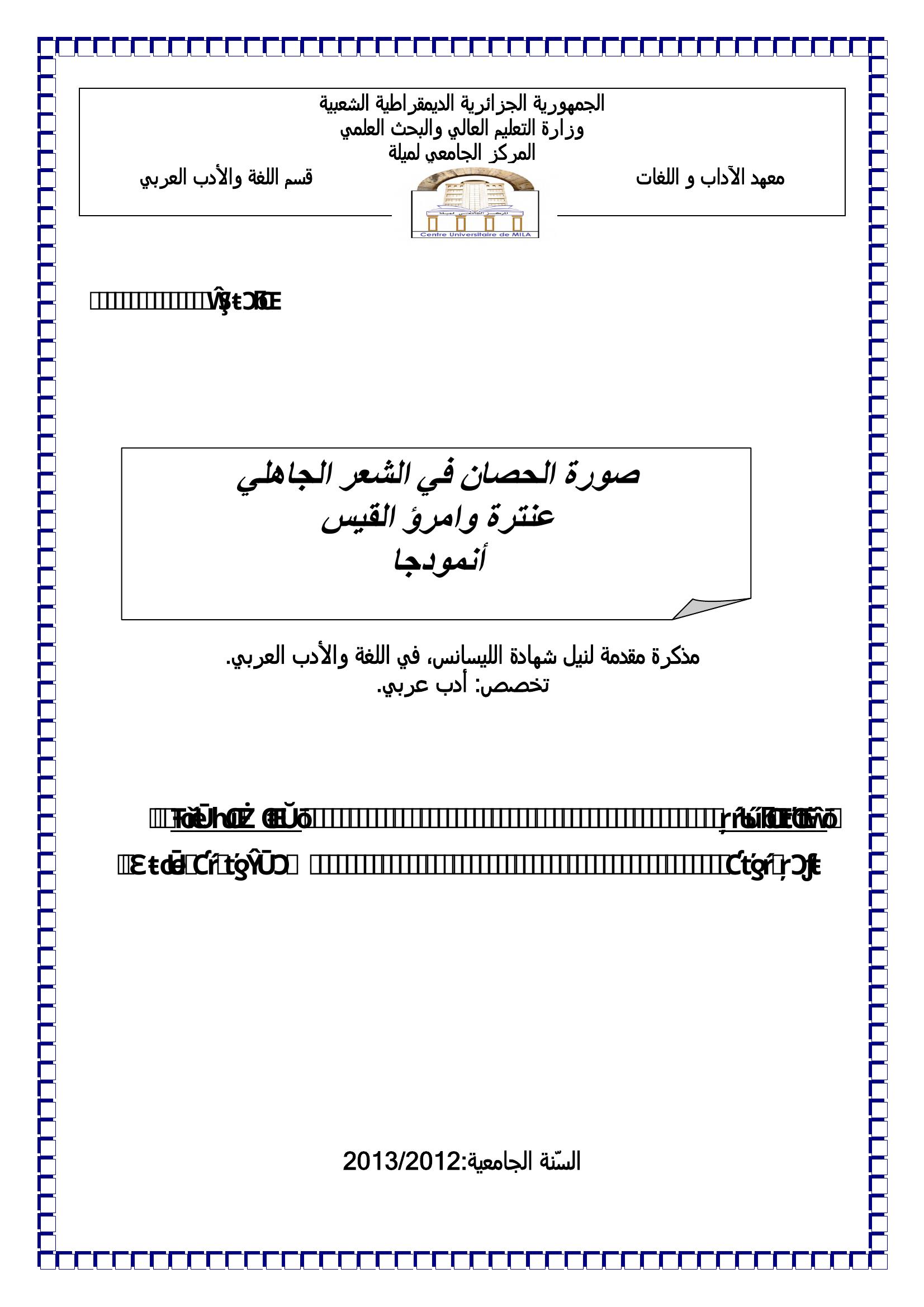 ريمة بودن & بن ساري مسعود(مشرفا) (2013). صورة الحصان في الشعر الجاهلي عنترة وامرؤ القيس أنموذجا.