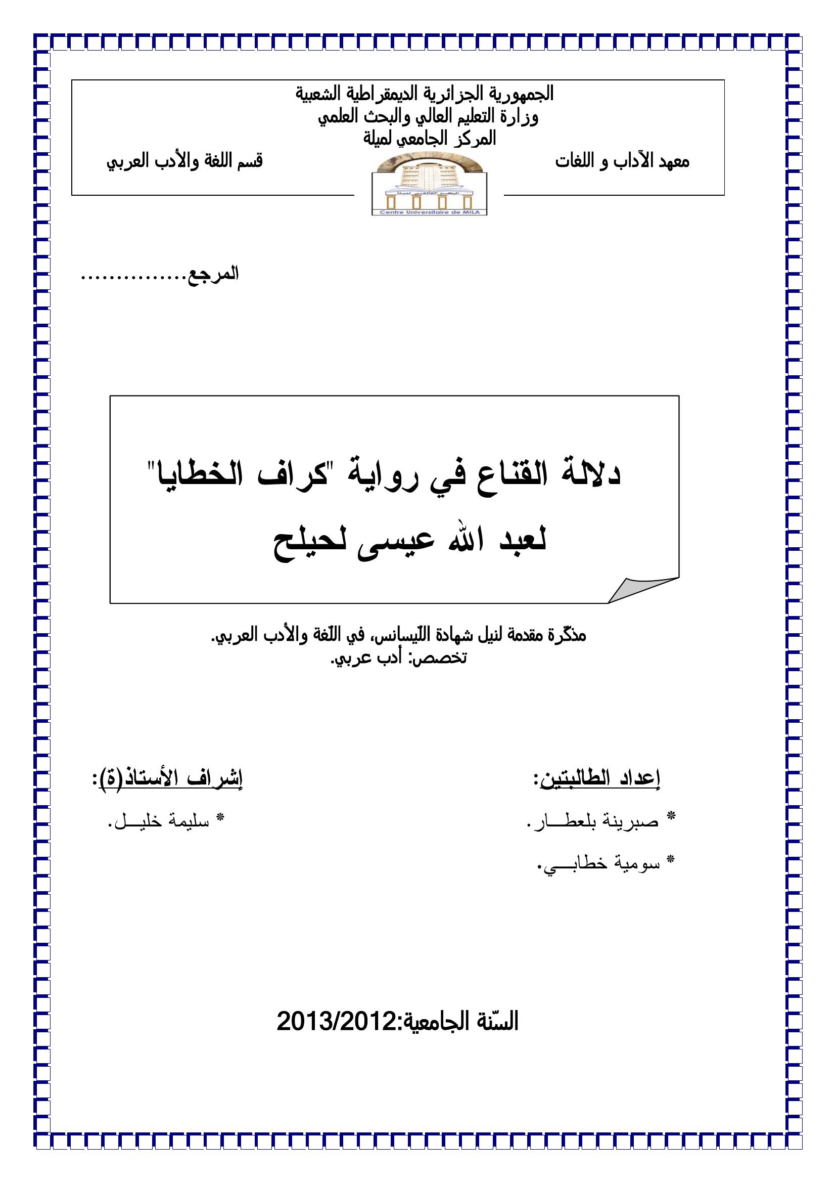 صبرينة بلعطار et al. (2013). دلالة القناع في رواية " كراف الخطايا " لعبد الله عيسى لحيلح.