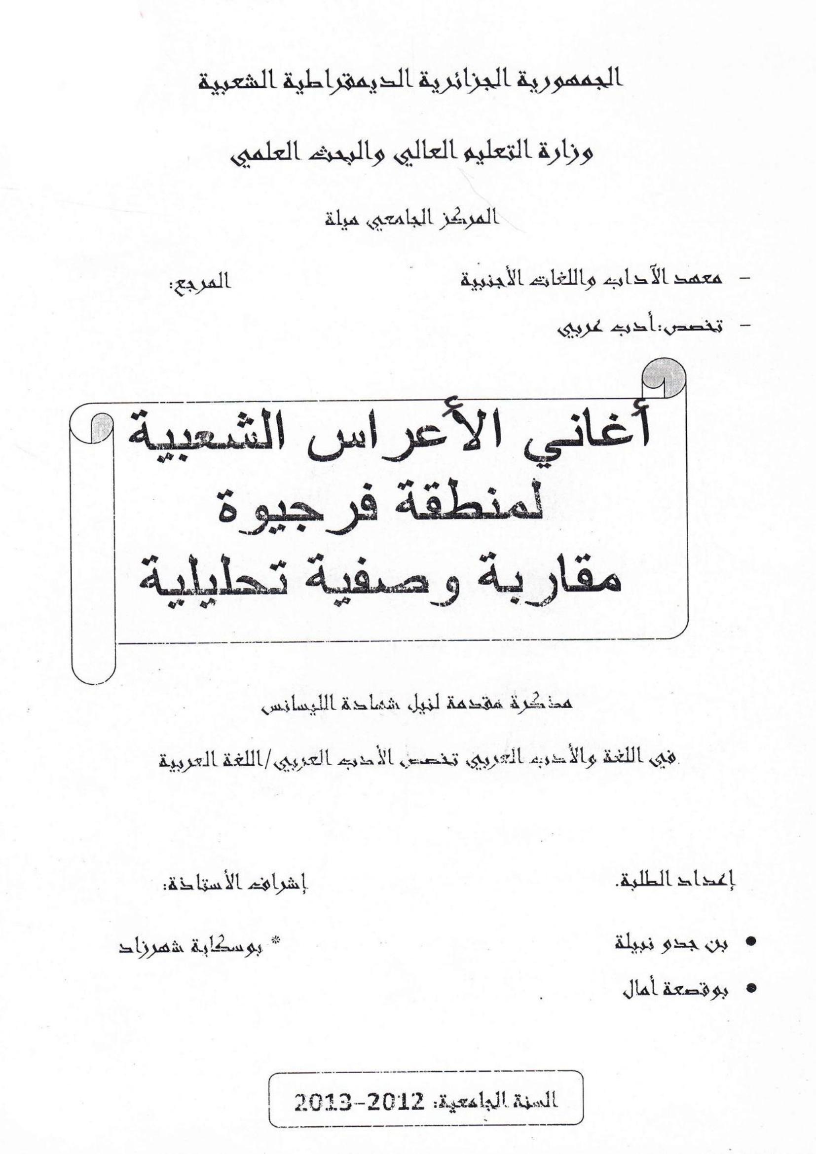 بن جدو نبيلة et al. (2013). أغاني الأعراس الشعبية لمنطقة فرجيوة مقاربة وصفية تحليلية.