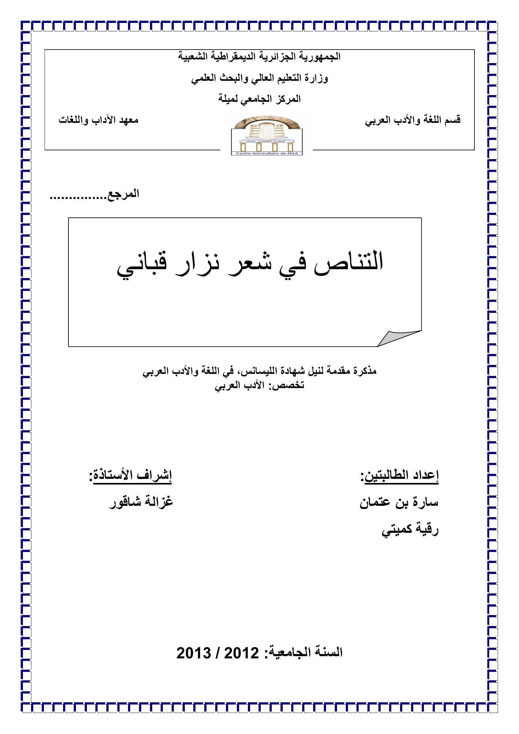 سارة بن عتمان et al. (2013). التناص في شعر نزار قباني.
