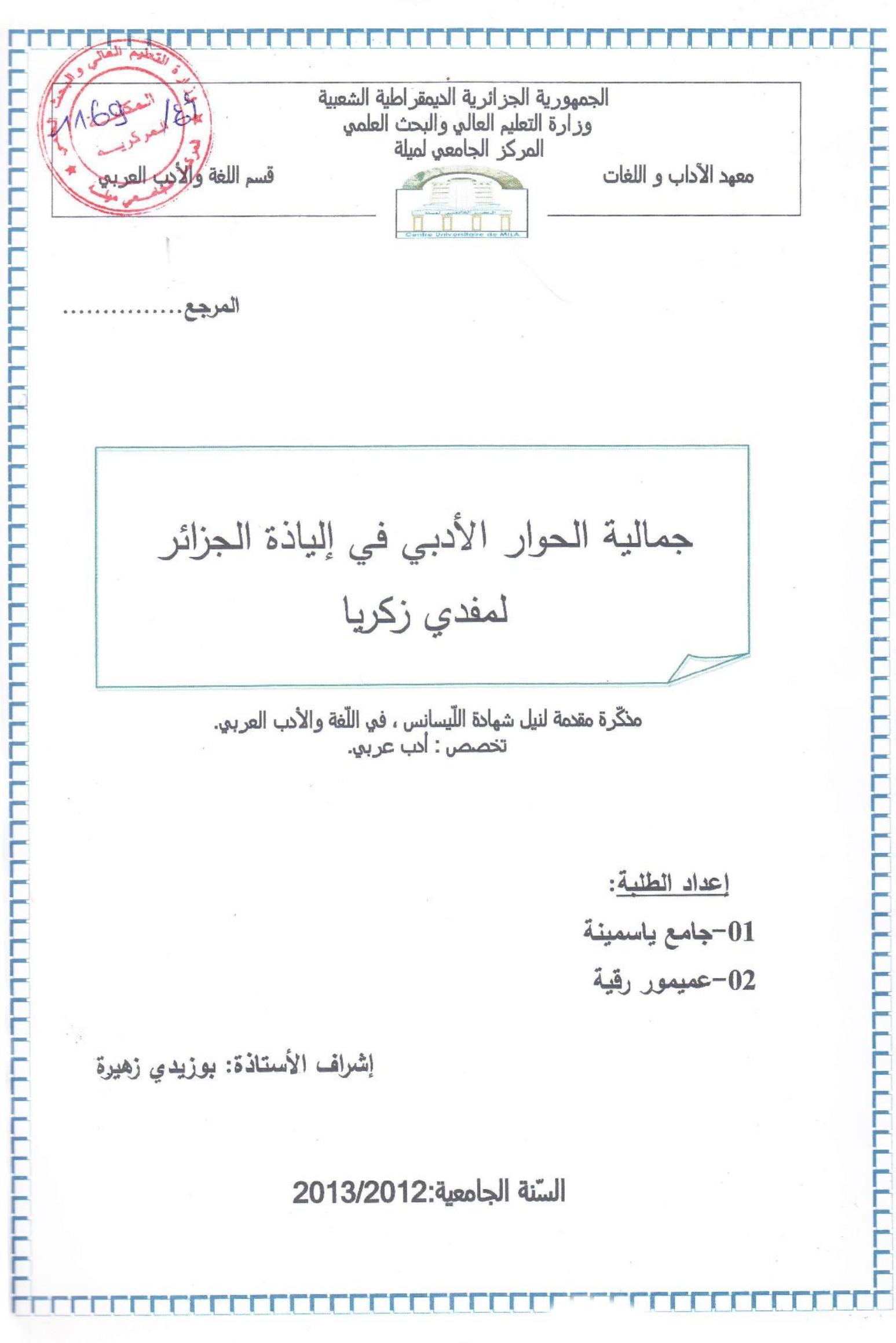 جامع ياسمينة et al. (2013). جمالية الحوار الأدبي في إليادة الجزائر لمفدي زكريا.