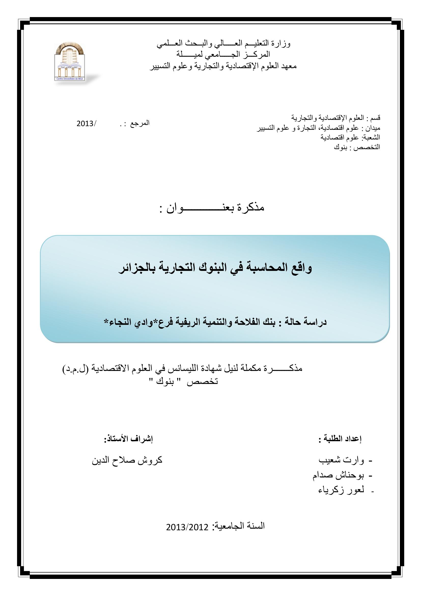 وارت شعيب & كروش صلاح الدين(مشرفا) (2013). واقع المحاسبة في البنوك التجارية بالجزائر دراسة حالة بنك الفلاحة والتنمية الريفية فرع - وادي النجاء -.