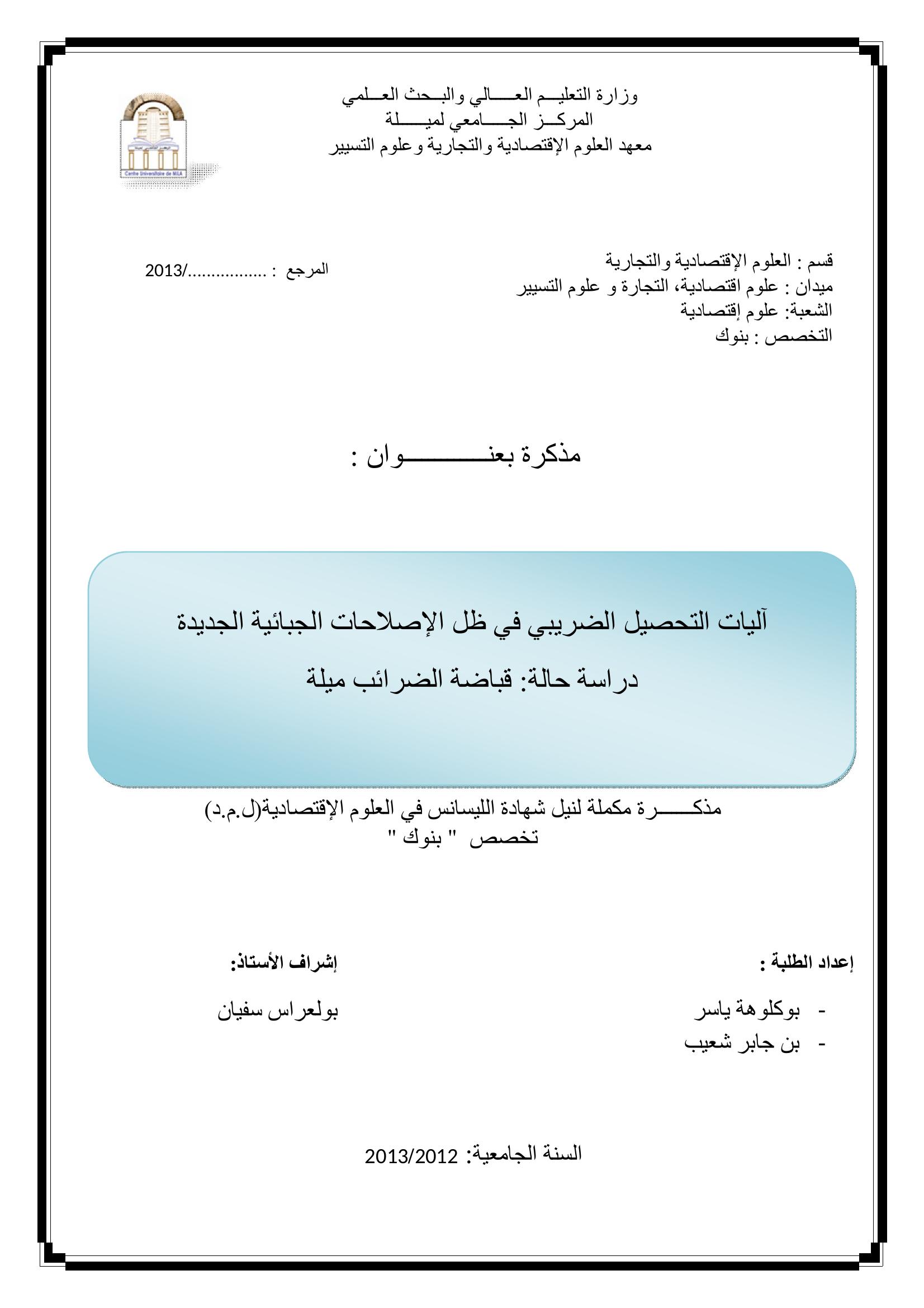 بوكلوهة ياسر & بولعراس سفيان(رئيسا) (2013). أليات التحصيل الضريبي في ظل الإصلاحات الجبائية الجديدة دراسة حالة قباضة الضرائب ميلة.