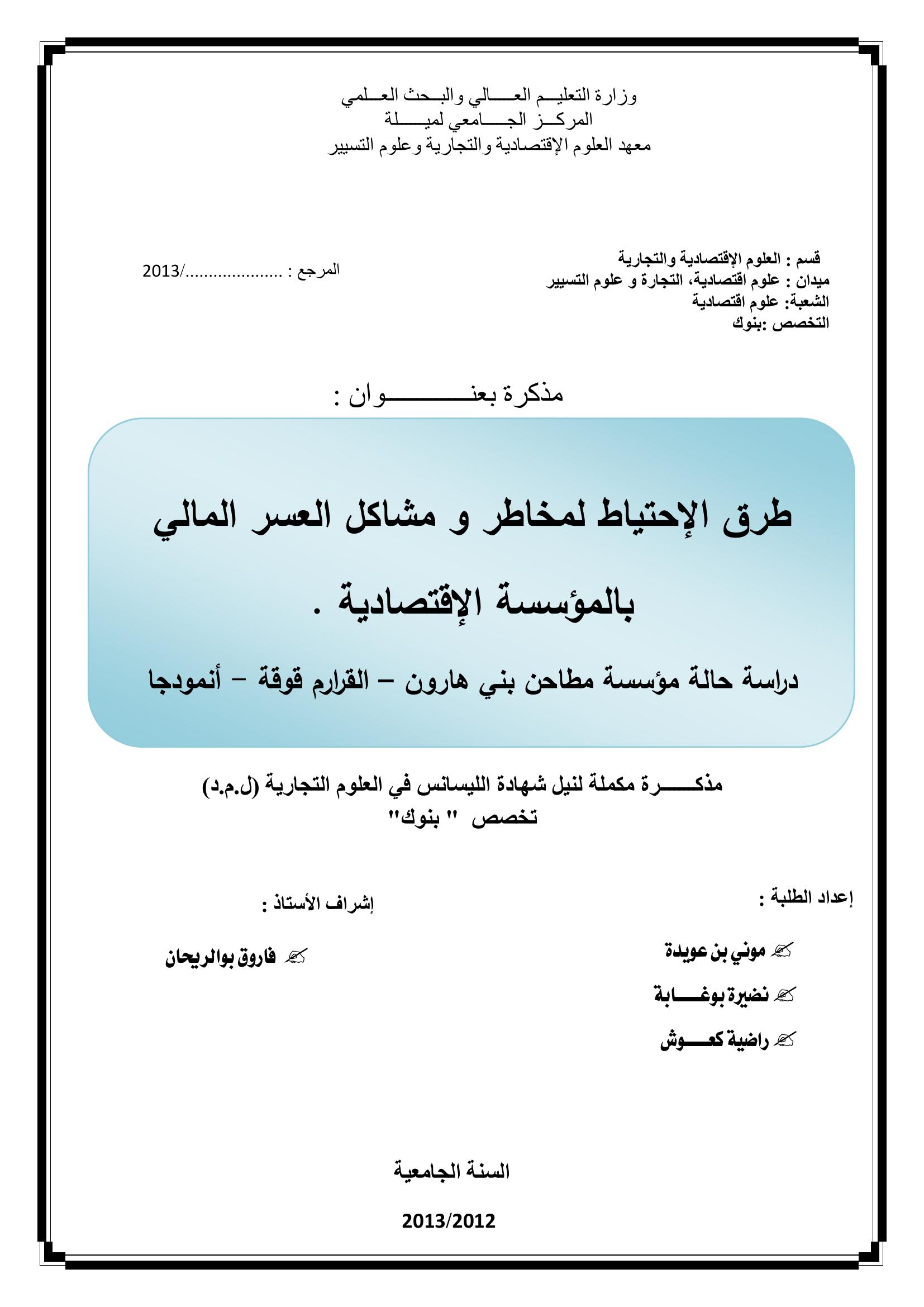 موني بن عويدة & فاروق بوالريحان(مشرفا) (2013). طرق الإحتياط لمخاطر ومشاكل العسر المالي بالمؤسسة الإقتصادية دراسة حالة مؤسسة مطاحن بني هارون - القرارم قوقة -.