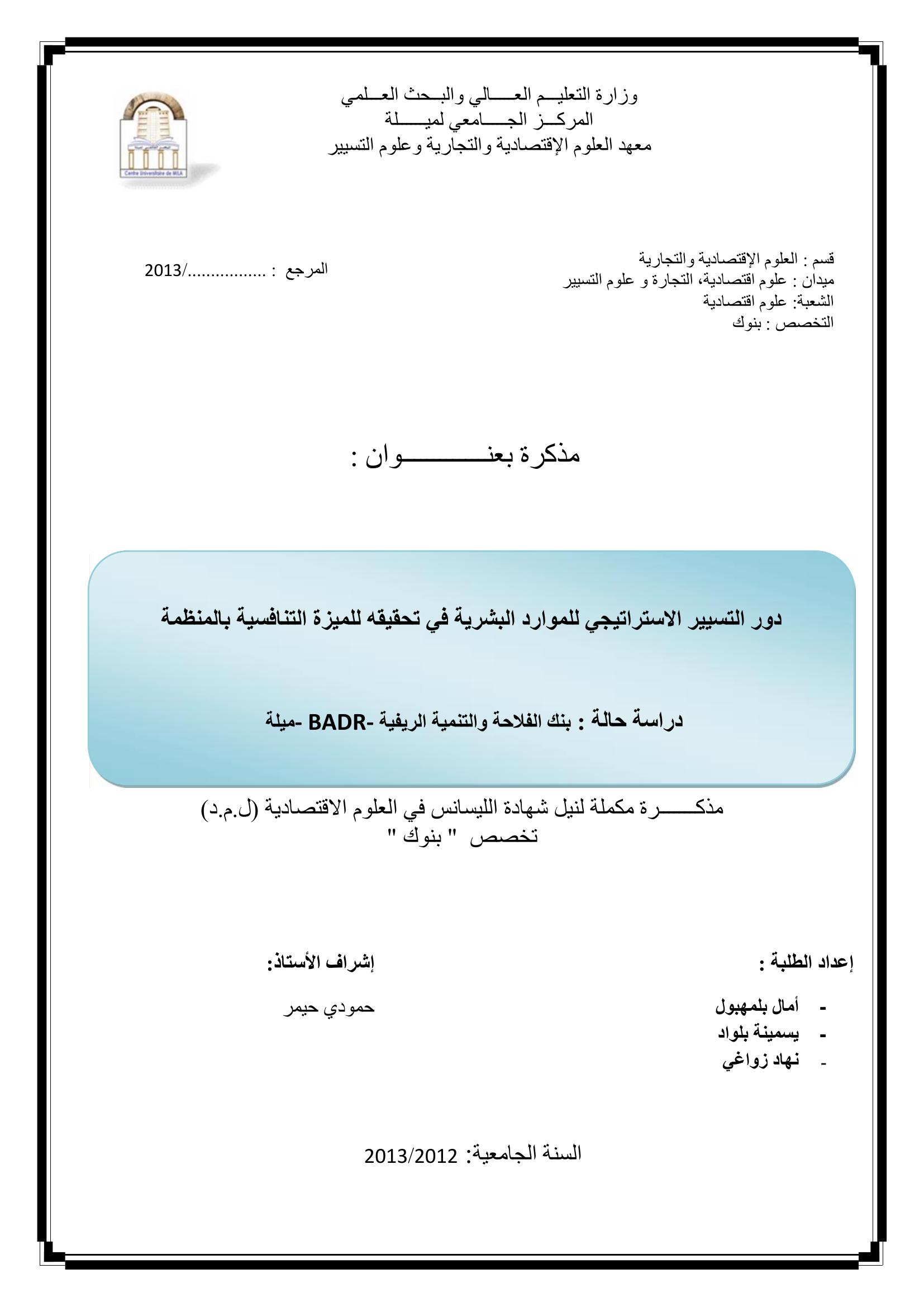 أمال بلمهبول & حمودي حيمر(مشرفا) (2013). دور التسيير الاستراتيجي للموارد البشرية في تحقيقه للميزة التنافسية بالمنظمة دراسة حالة بنك الفلاحة والتنمية الريفية - ميلة -.