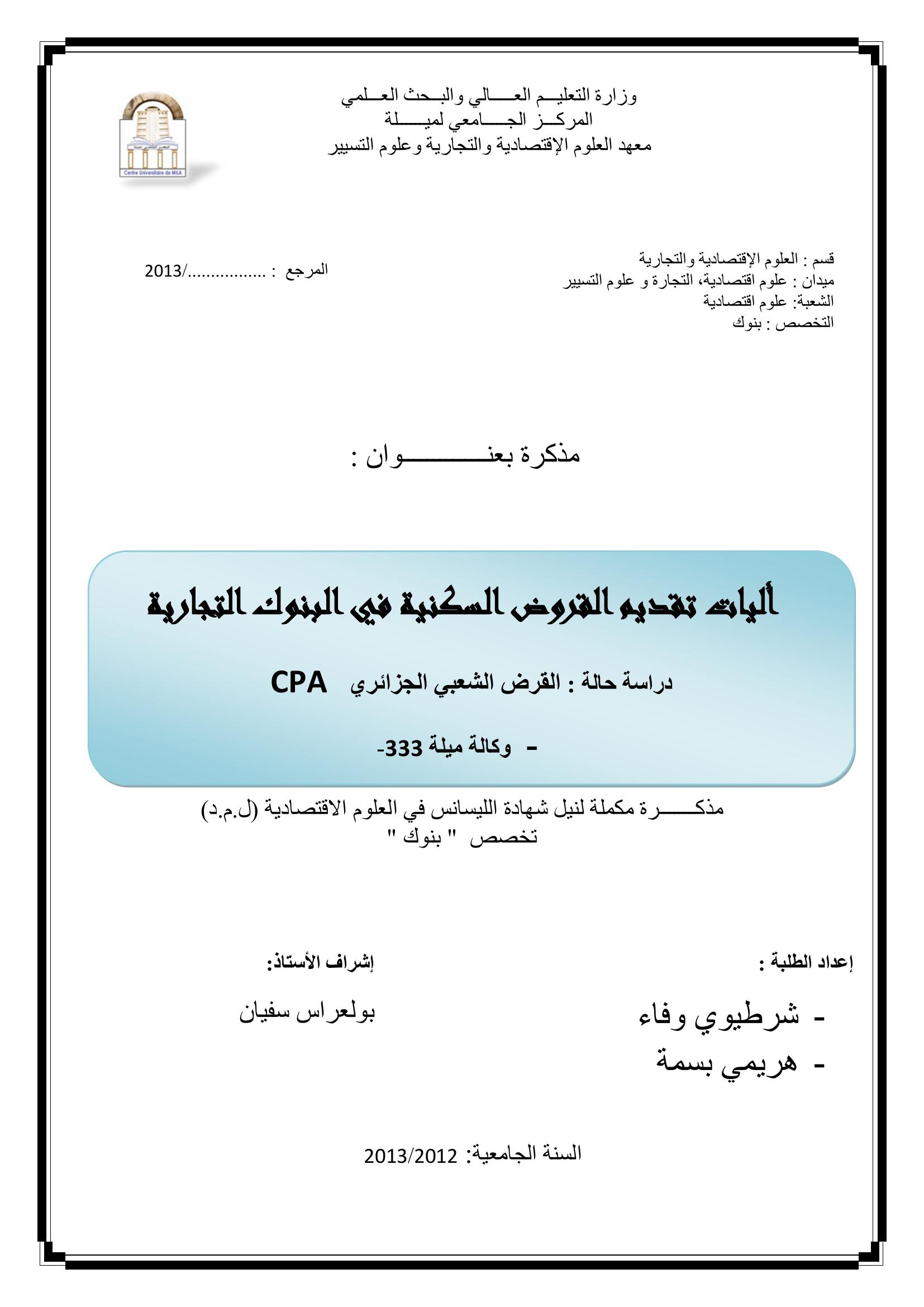 أليات تقديم القروض السكنية في البنوك التجارية دراسة حالة القرض الشعبي الجزائري - ميلة 333-